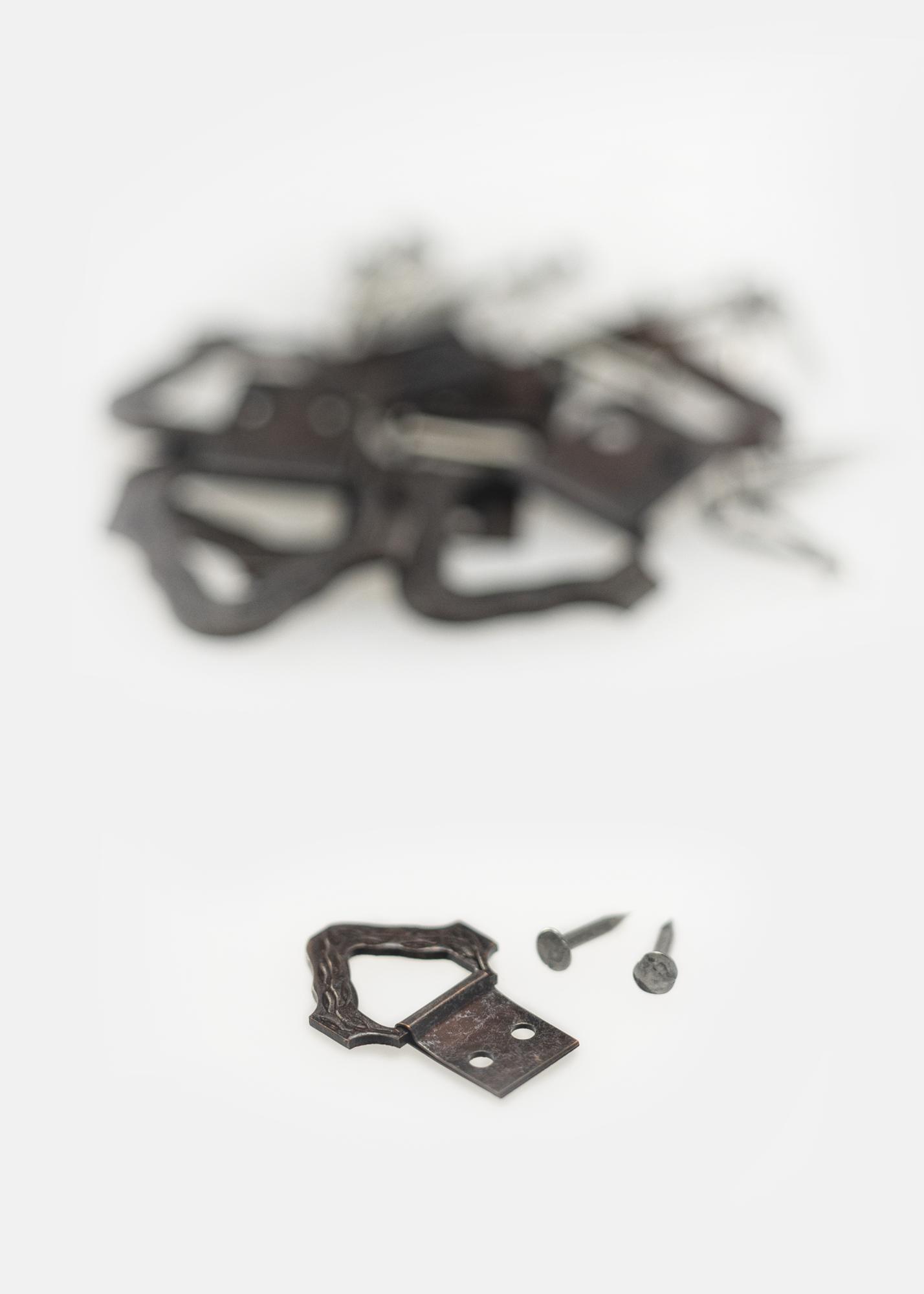 Un crochet triangle un peu plus exclusif qui est cloué à l'arrière du cadre. Parfait pour les cadres plus anciens et légèrement plus fins. Le crochet est fait pour être visible au-dessus du cadre lorsque vous accrochez le cadre. Vous choisissez si vous utilisez un ou deux crochets. Celui-ci est fait pour des cadres légèrement plus légers (taille maximale du cadre: 24x30 cm).