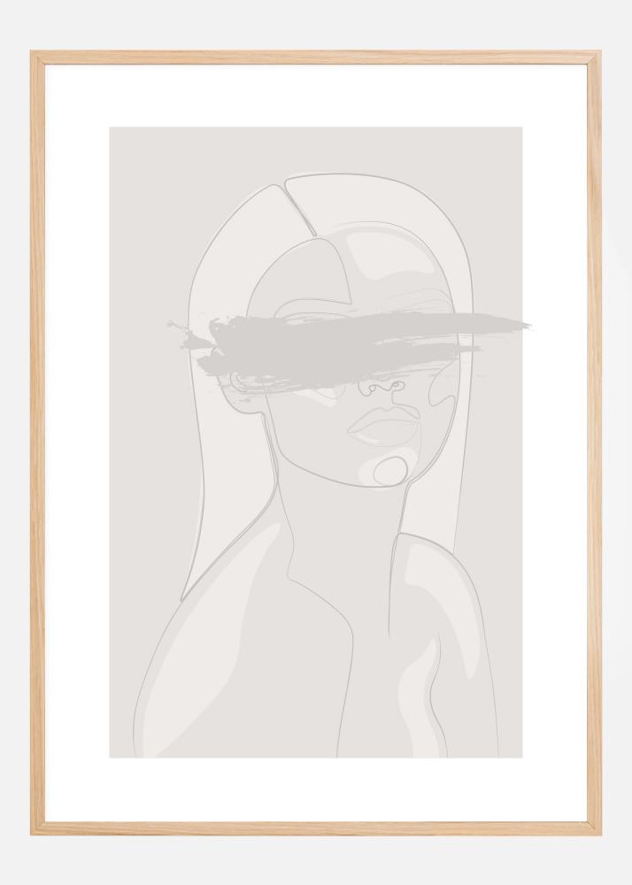 Une affiche abstraite d'une femme aux yeux cachés. Ce tableau blanc et gris pâle représente la tête et les épaules d'une femme sous forme de blocs et de lignes. Une touche de peinture recouvre ses yeux, créant le mystère autour d’elle. Une bordure blanche l'encadre : parfait pour compléter un mur monochrome à la maison.