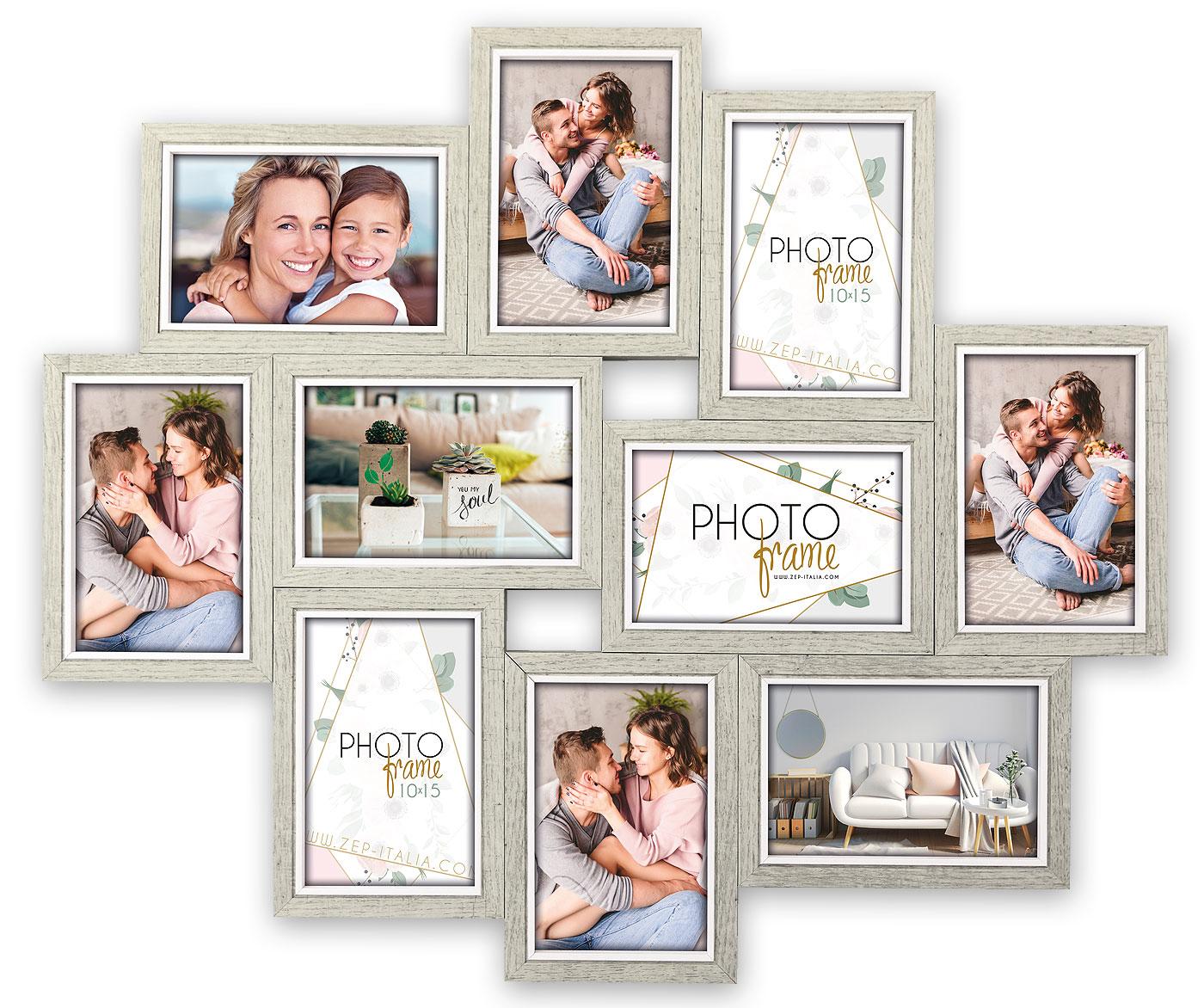 Voici un beau cadre multivues avec de l'espace pour 10 images de format 10x15 cm. Le cadre multivues est fabriqué en bois et se présente dans une teinte gris clair, ce qui lui apporte un caractère d'autant plus rustique. Les dimensions intérieures du cadre sont de 50x59 cm. Supports muraux inclus.
