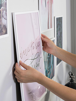 Le choix des cadres aide à donner le ton au mur de tableaux. Il est courant de choisir des cadres dans une ou deux couleurs afin que tous les tableaux sur le mur s'entremêlent ensemble de manière naturelle. Si vous recherchez un effet plus dramatique, vous pouvez avantageusement choisir de faire le contraire en mélangeant et en assortissant des cadres photo aux couleurs, formes et designs complètement différents.