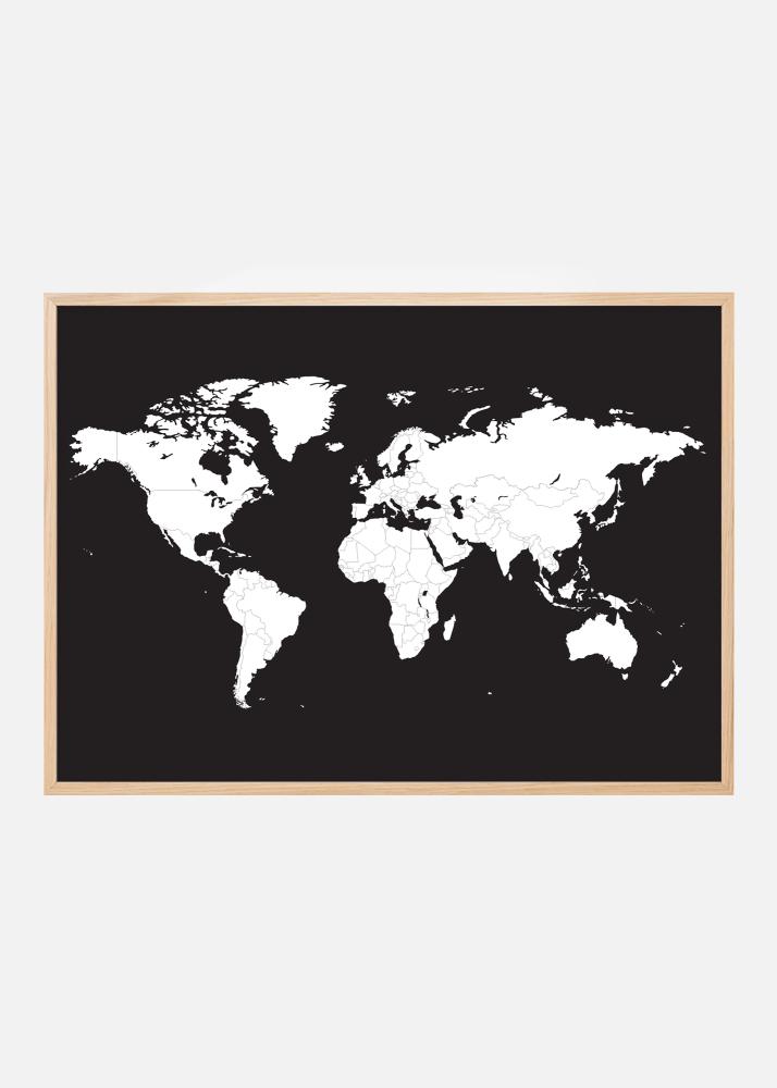 Superbe affiche graphique d'une carte du monde blanche sur un fond noir. L'affiche devient un point de mire sur le mur avec son contraste net dans le motif et elle est bien adaptée pour être utilisée sur un mur de cadres avec d'autres prints graphiques ou des images en noir et blanc de destinations célèbres. Encadrez le print avec un cadre qui correspond au reste de la décoration de la pièce pour créer une sensation d'unité et permettre à l'image de s'exprimer pleinement.