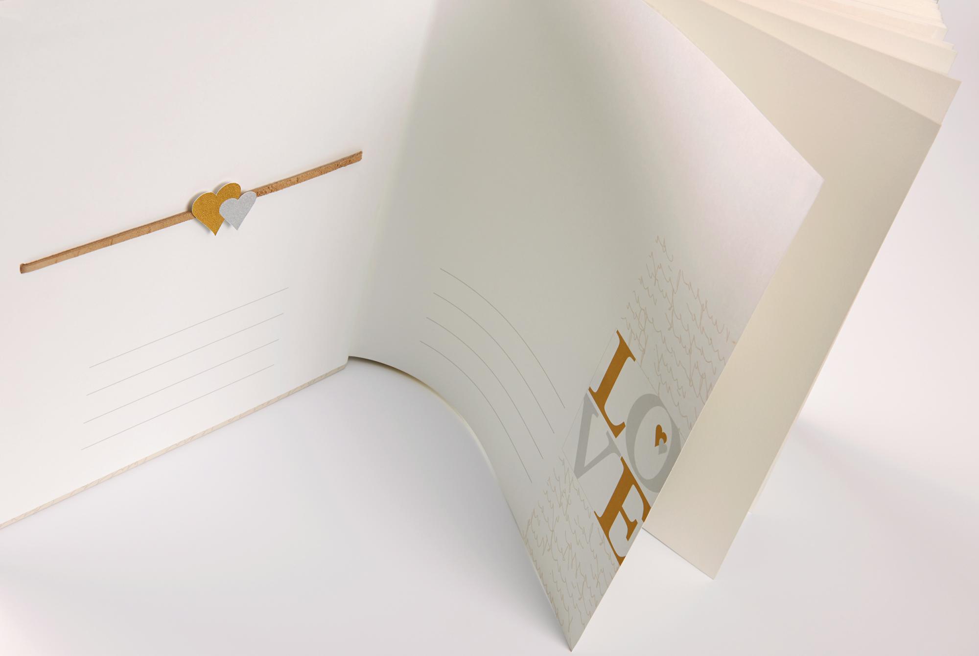 Album photo pour vos images de mariage où vous pouvez vous-même changer l'image sur le devant. Lorsque vous ouvrez l’album de mariage, vous êtes accueilli par deux pages magnifiquement illustrées avec beaucoup de place pour vos propres notes.
