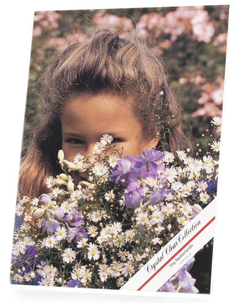 Porte-photo en plastique transparent et penché en arrière, destiné à être placé par exemple sur une table.