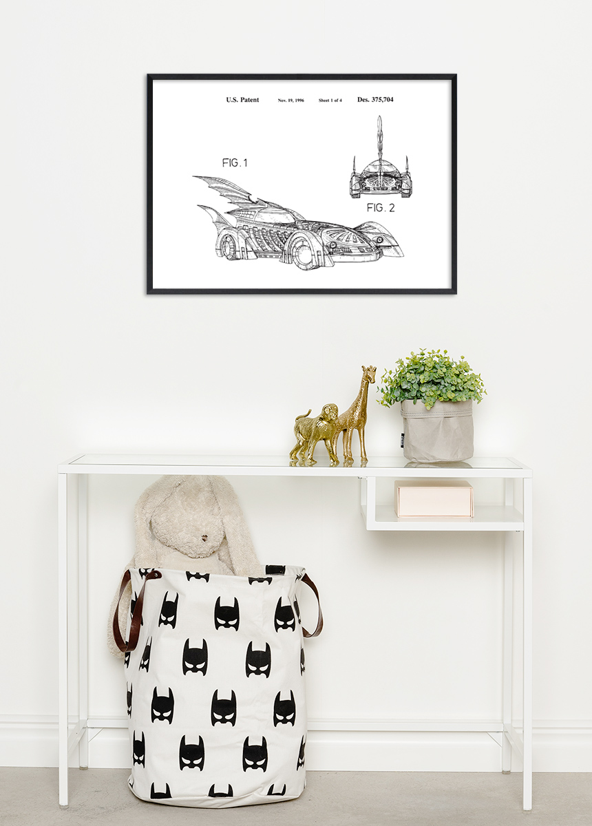 Cette affiche élégante de brevet est un hommage au design révolutionnaire et fait partie du brevet américain Des. 375,704, enregistré le 19 novembre 1996. Les illustrations sur ce dessin de brevet – FIG. 1 et FIG. 2 – représentent une spectaculaire Batmobile qui montre non seulement une innovation technique, mais aussi une esthétique exceptionnelle. Avec son langage de formes dynamique et sa conception riche en détails, cette affiche donne une impression de mouvement et de progression qui capte l’attention du spectateur.