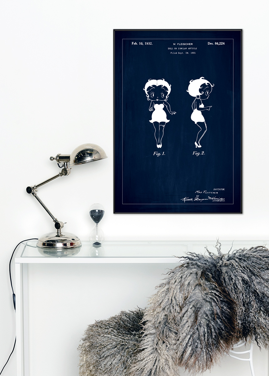 Ce poster de brevet du 16 février 1932 montre une poupée de Betty Boop, conçue par M. Fleischer. Le numéro de brevet est Des. 86,224, et la demande a été déposée le 24 septembre 1931. Sur cette illustration, nous voyons deux figures de la poupée; une de face et une de côté, ce qui dépeint les caractéristiques et la forme distinctives de la poupée.