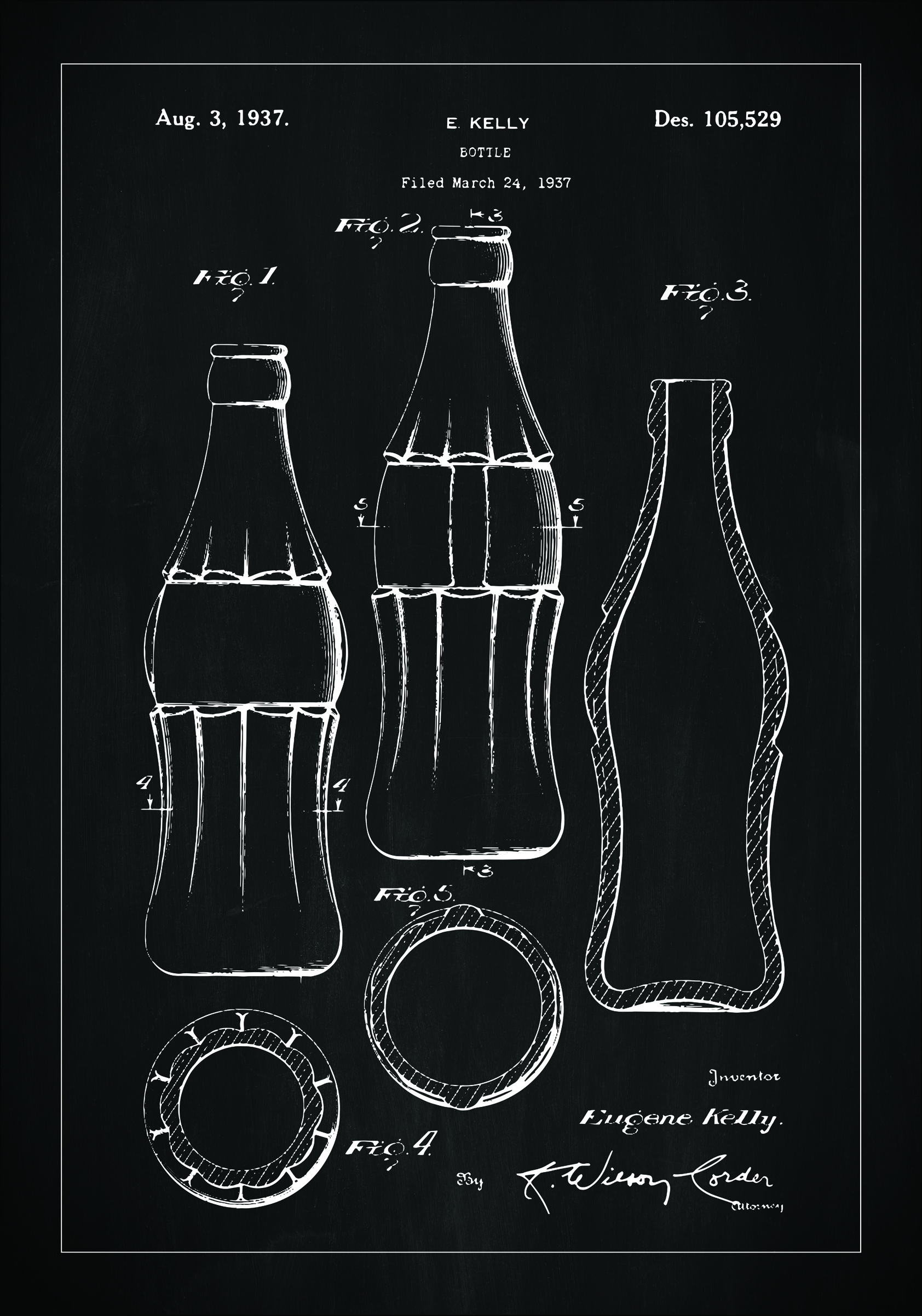 Le design de la bouteille, présenté dans son ensemble et en coupe, transmet une esthétique intemporelle qui est devenue synonyme de certaines des boissons les plus appréciées au monde. Ce dessin de brevet n'est pas seulement une partie de l'histoire du design, c'est aussi une icône culturelle qui a influencé la publicité et les habitudes de consommation à l'échelle mondiale. En tant qu'affiche de brevet, elle est un article décoratif élégant qui s'intègre parfaitement dans une variété de décors intérieurs, des maisons modernes aux bars et restaurants inspirés du vintage.
