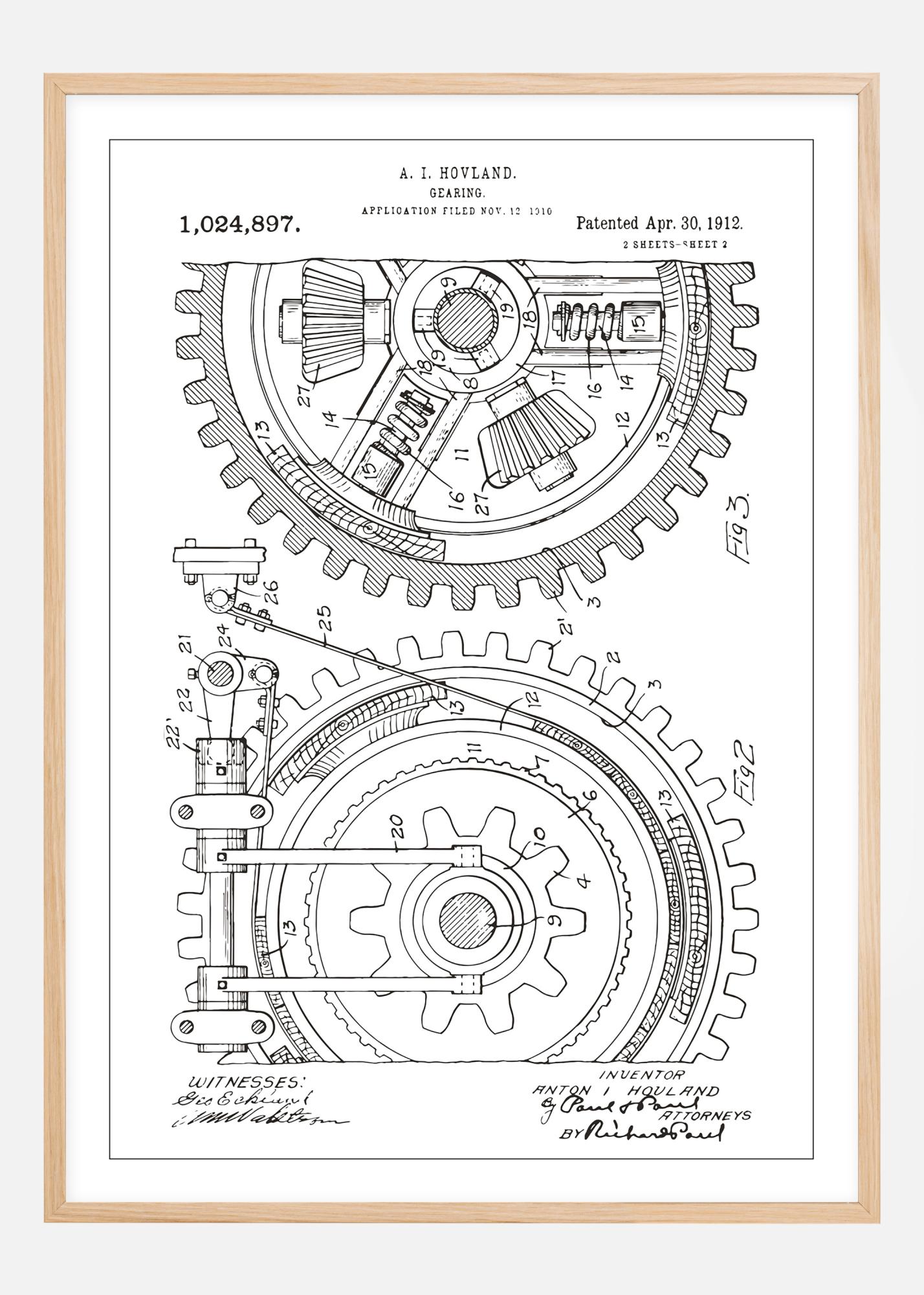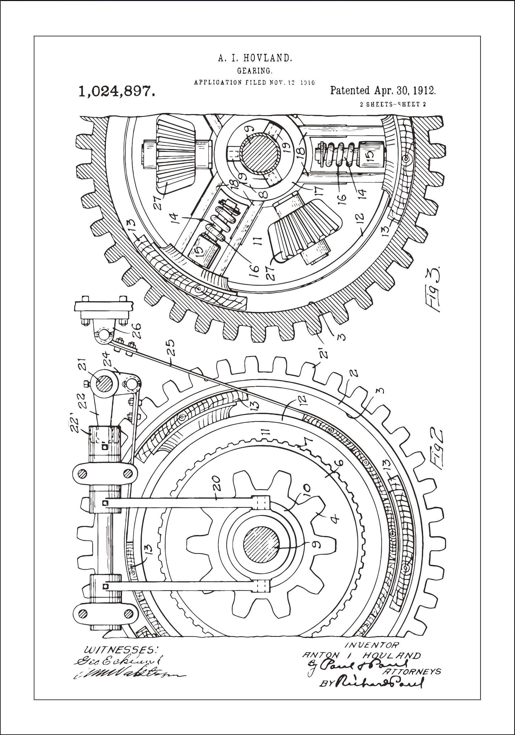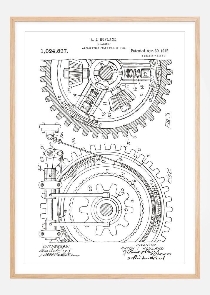 Ornez votre mur avec cette affiche de brevet classique présentant le design complexe de boîte de vitesses de A. I. Hovland, brevet numéro 1,024,897, accordé le 30 avril 1912. Ce dessin détaillé met en évidence l'habileté technique et la complexité des premières conceptions mécaniques. Les lignes élégantes et les détails minutieux de ce dessin de brevet offrent une compréhension plus profonde de l'histoire de l'art de l'ingénierie et constituent un complément majestueux à tout style de décoration technique ou industrielle.