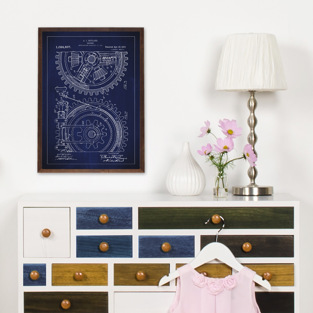 Décorez votre espace avec cette élégante affiche de brevet qui décrit en détail l'invention par A. I. Hovland d'un mécanisme de transmission, brevet numéro 1,024,897, accordé le 30 avril 1912. Ce travail complexe de dessin technique met en lumière une époque d'innovation et de construction mécanique. Avec ses contrastes audacieux et ses illustrations complexes, c'est un ajout enchanteur à un bureau d'ingénieur, un atelier, ou tout environnement industriel où la machinerie et le design sont hautement valorisés.