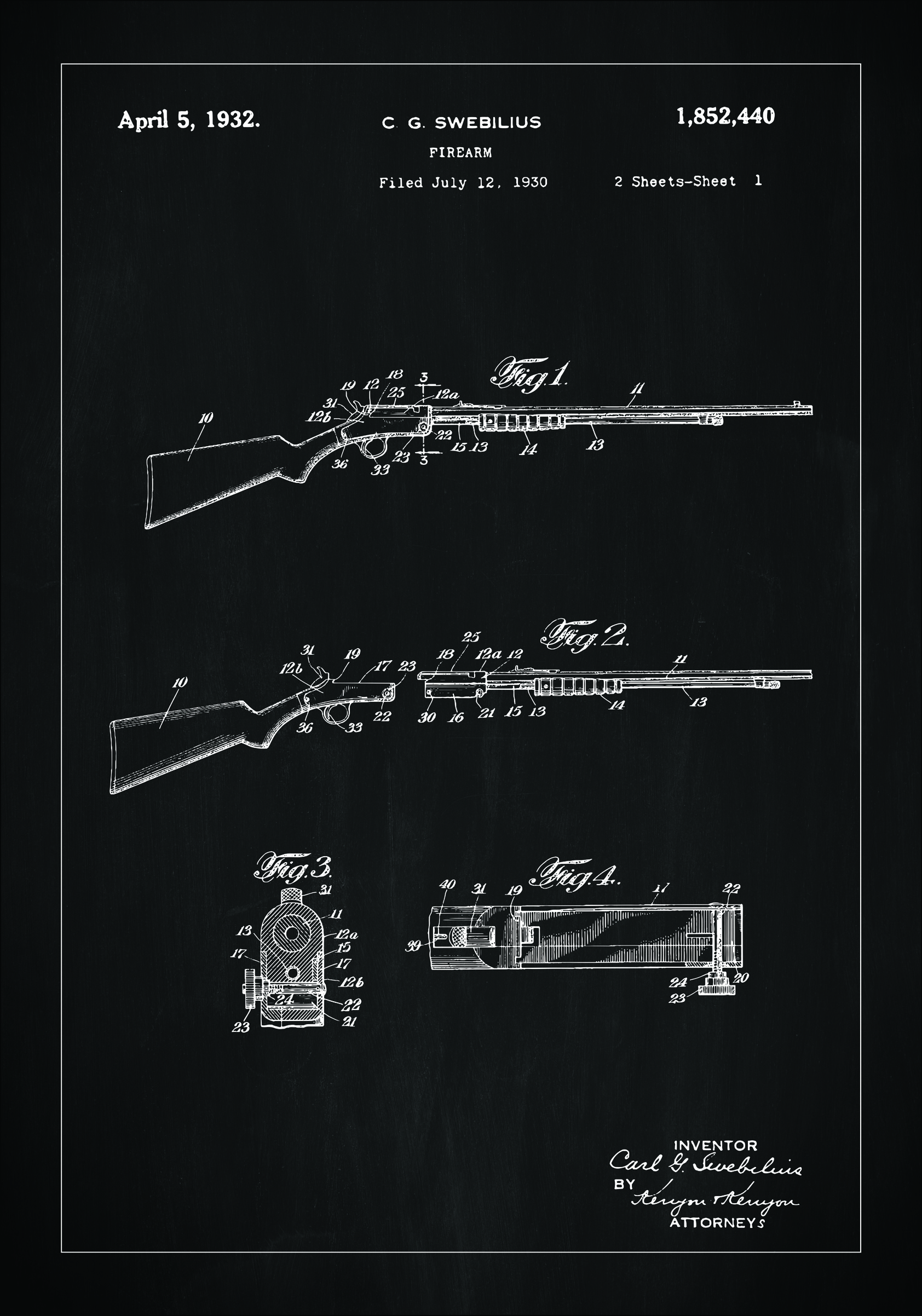 Cette affiche de brevet présente un dessin détaillé d'un fusil du début du XXe siècle, spécifiquement daté du 5 avril 1932. Le brevet, portant le numéro 1,852,440, a été déposé le 12 juillet 1930 par l'inventeur C. G. Swebilius. Cette représentation artistique des détails mécaniques du fusil est un excellent exemple de dessin et de conception techniques. Ce dessin de brevet illustre habilement les composants complexes qui interagissent pour créer un produit fonctionnel et innovant. L'affiche est un objet de collection idéal pour les passionnés d'histoire des armes et les amateurs de design.