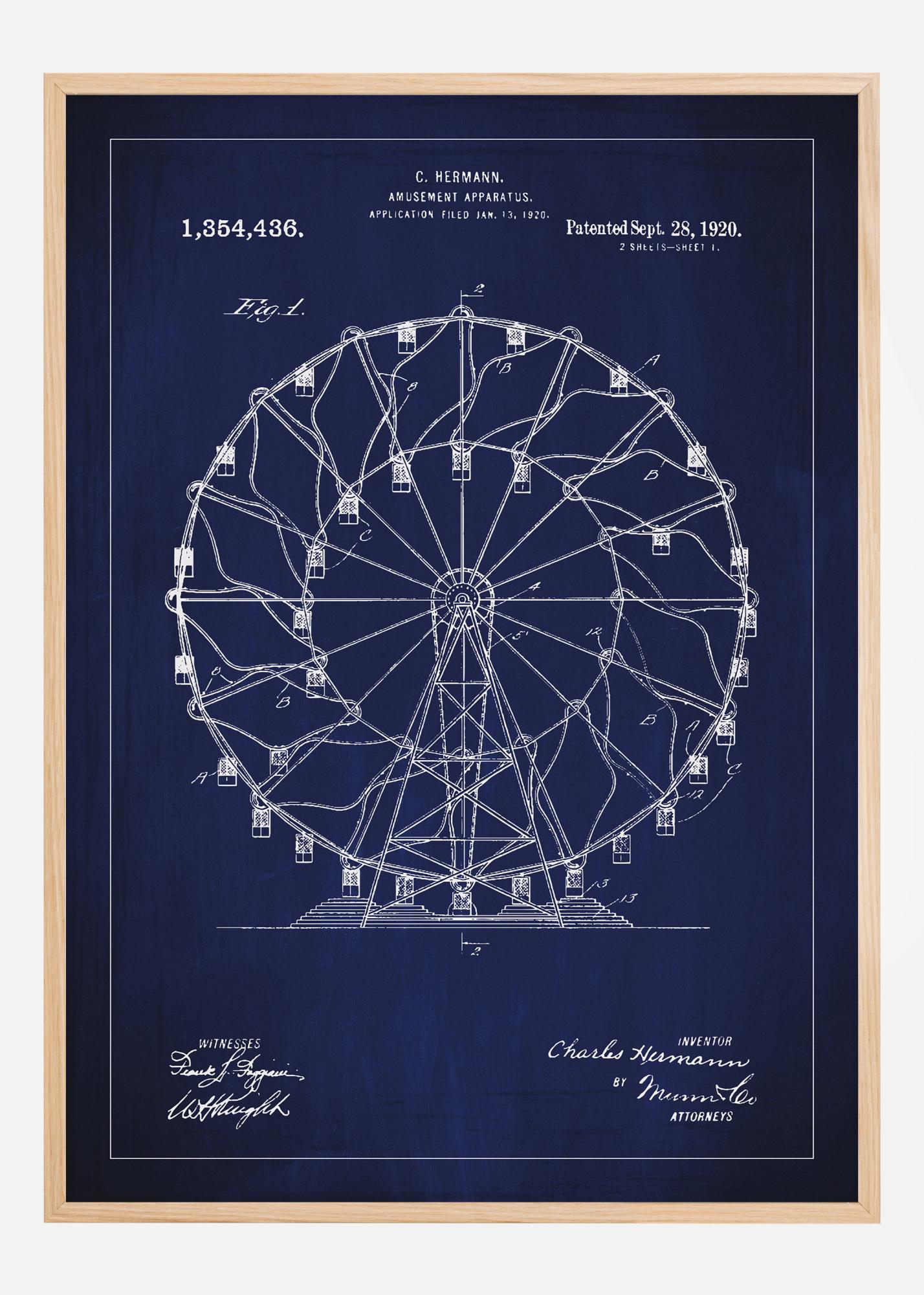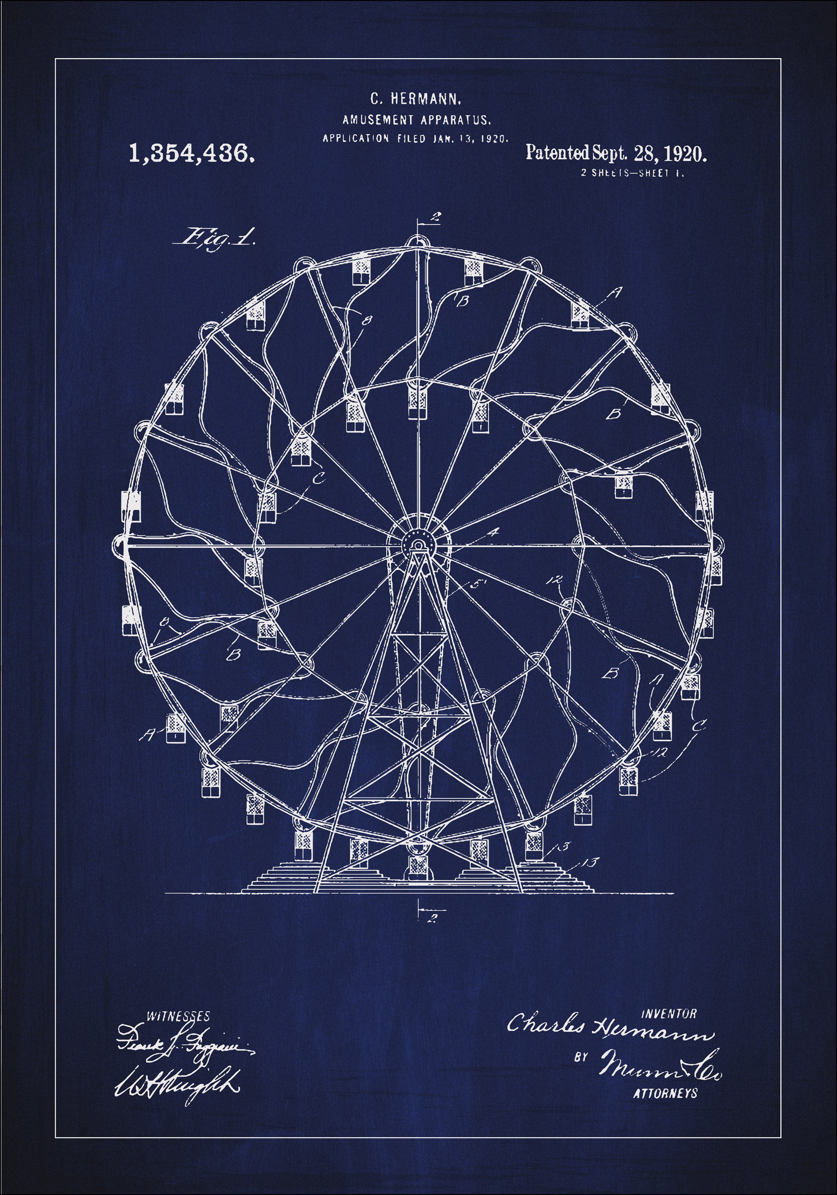 Transformez n'importe quel mur en un hommage à l'ingénierie classique avec cette affiche de brevet du design de C. Hermann pour une attraction foraine, spécifié dans le brevet numéro 1,354,436 accordé le 28 septembre 1920. Cette illustration habilement créée d'une grande roue n'est pas seulement une œuvre d'art décorative, mais aussi une représentation d'une époque où les loisirs sont devenus des exploits techniques. Les détails de la construction capturent une époque révolue de l'âge d'or des parcs d'attractions et les chefs-d'œuvre de l'art mécanique.