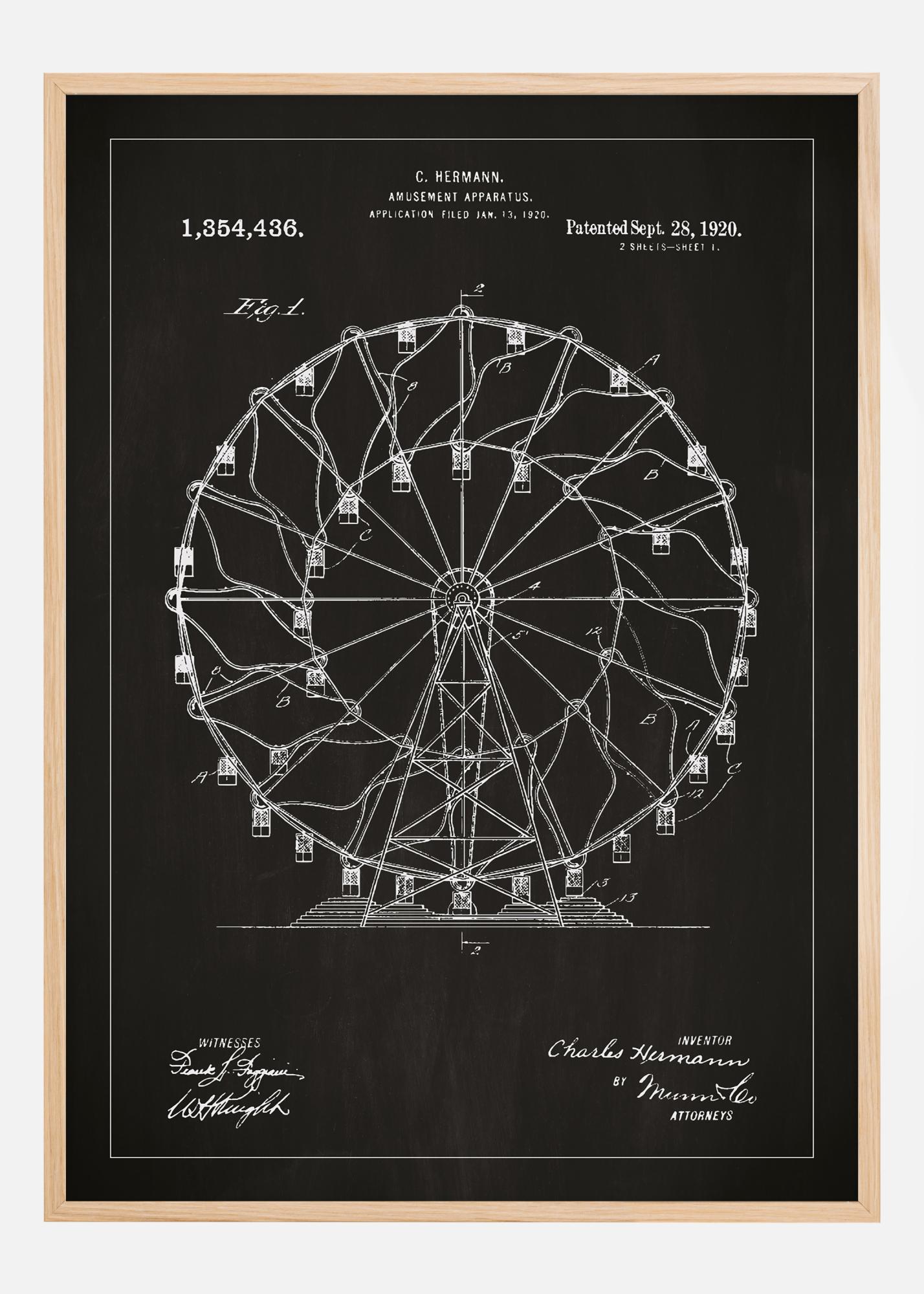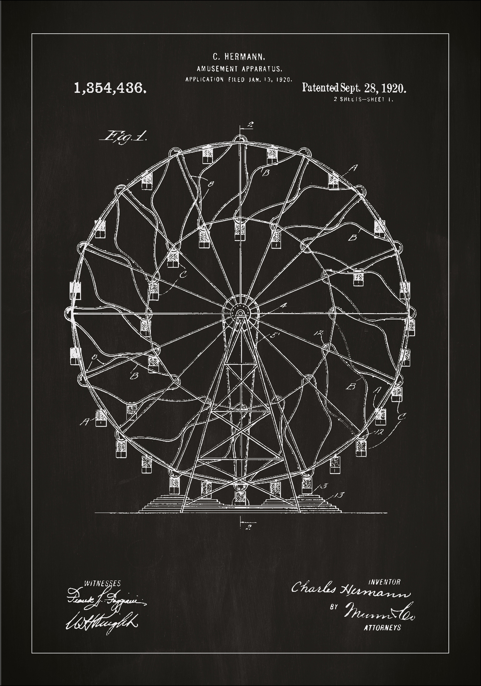 Ce poster de brevet présente la conception classique d'un parc d'attractions par C. Hermann, spécifiée dans le brevet numéro 1,354,436, délivré le 28 septembre 1920. Avec sa représentation détaillée d'une grande roue, ce dessin symbolise une ère d'innovation ludique et constitue un magnifique élément de décoration intérieure pour tous ceux qui ont un cœur pour les loisirs et la technologie historiques. Le design complexe et les détails minutieux captent l'attention et procurent une sensation nostalgique.