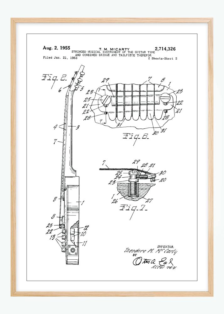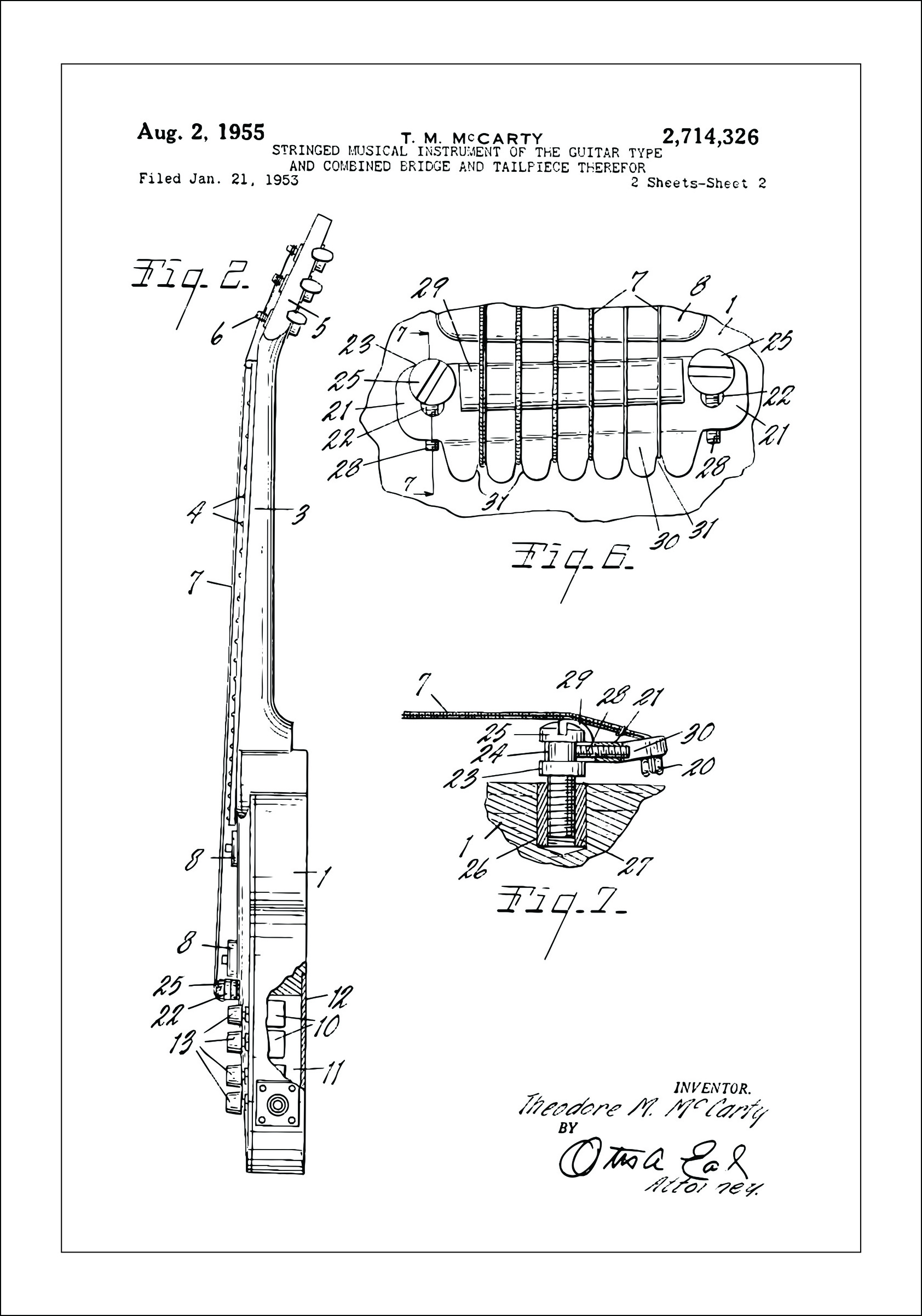 Cette affiche de brevet montre une invention pour un instrument de musique à cordes, spécifiquement une guitare électrique, avec un brevet accordé le 2 août 1955 sous le numéro de brevet 2,714,326. L'inventeur, Theodore M. McCarty, a déposé la demande le 21 janvier 1953. Les illustrations fournissent des vues détaillées du manche, du corps et de la tête de l'instrument, ainsi qu'une coupe transversale montrant comment les cordes sont connectées à la fois au chevalet et au cordier de la guitare.
