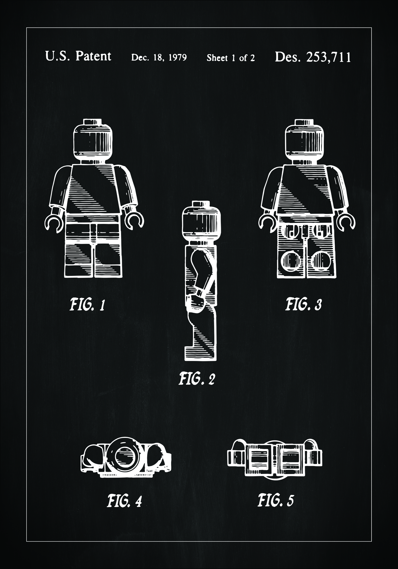 Ce poster de brevet illustre l'ingéniosité dans le design de jouets, représentée par le brevet Des. 253,711 daté du 18 décembre 1979. Le dessin de brevet montre une construction éclatée d'une figurine de jouet Lego, présentée sous plusieurs angles : vue de face, vue latérale et vues détaillées de la tête et du corps. Les cinq figures sont numérotées et démontrent la capacité du jouet à être démonté et assemblé, une fonction qui a inspiré toute une génération de conceptions de jouets.
