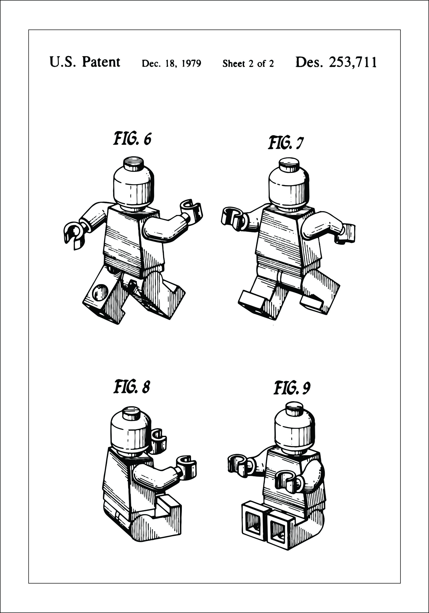 Ce poster de brevet décrit une figurine Lego, qui a été enregistrée au bureau américain des brevets le 18 décembre 1979 sous le numéro de brevet Des. 253,711. L'illustration montre quatre positions différentes de la figurine, offrant une perception dynamique et tridimensionnelle de son design et de sa fonctionnalité. Chaque image montre la mobilité de la figurine et les différentes poses qu'elle peut prendre.