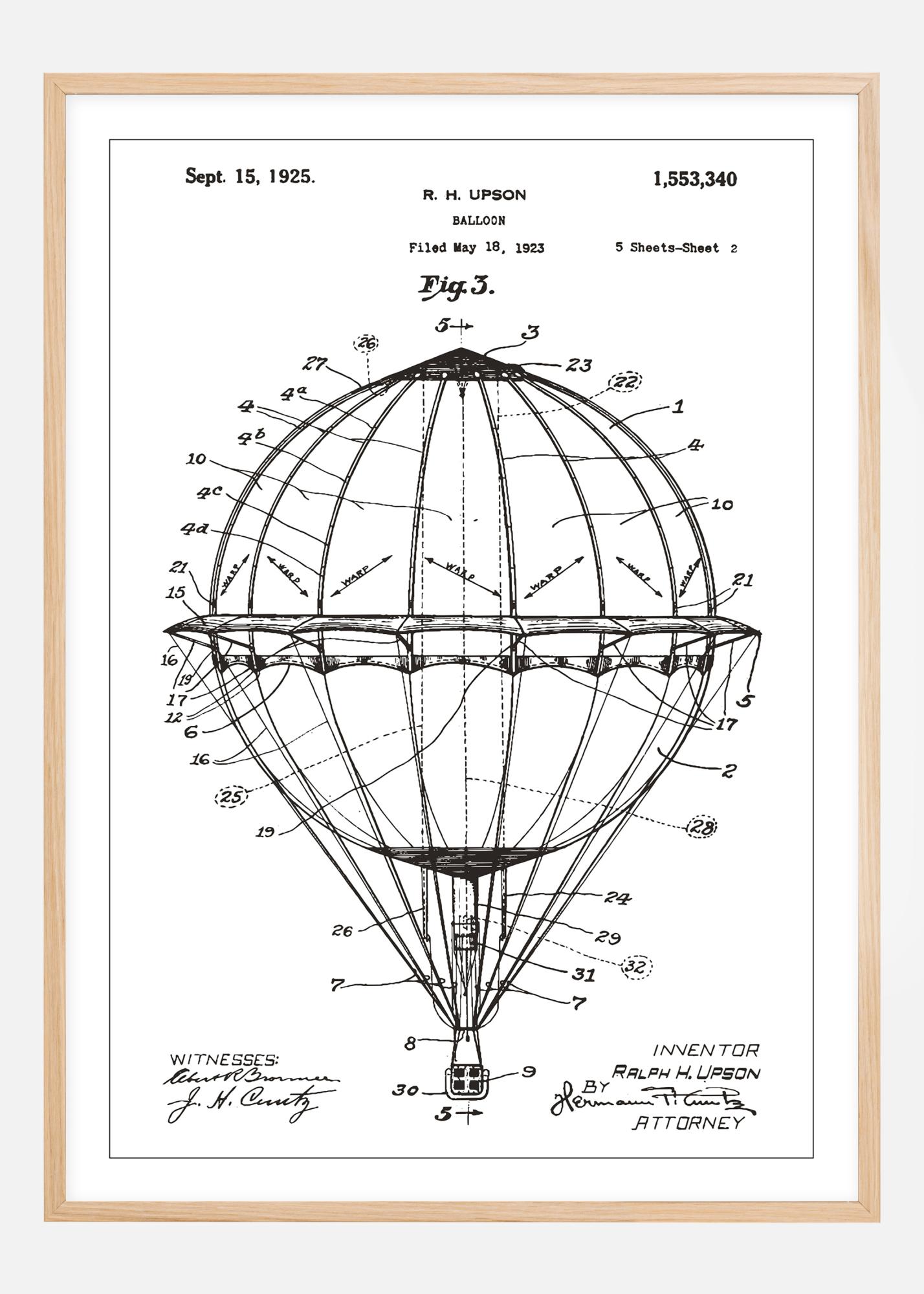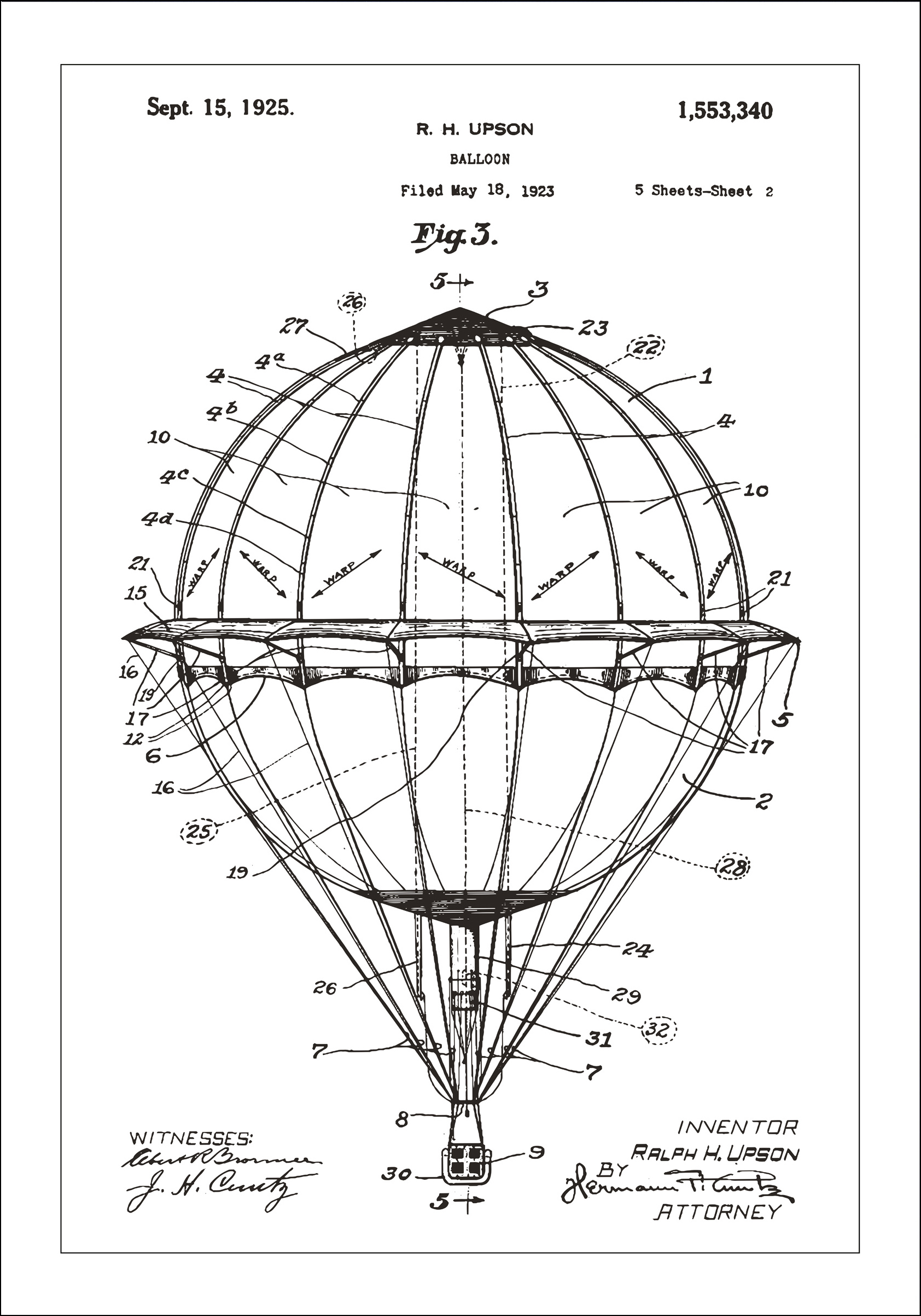 Plongez dans un monde d'innovation précoce avec cette affiche de brevet exclusive présentant le design d'un ballon à air, l'une des nombreuses grandes inventions de Ralph H. Upson. Le brevet, délivré le 15 septembre 1925 avec le numéro d'enregistrement 1,553,340, montre un niveau de détail extraordinaire et de génie. C'est un détail artistique parfait pour celui ayant une affection pour l'histoire de l'aviation et la construction.