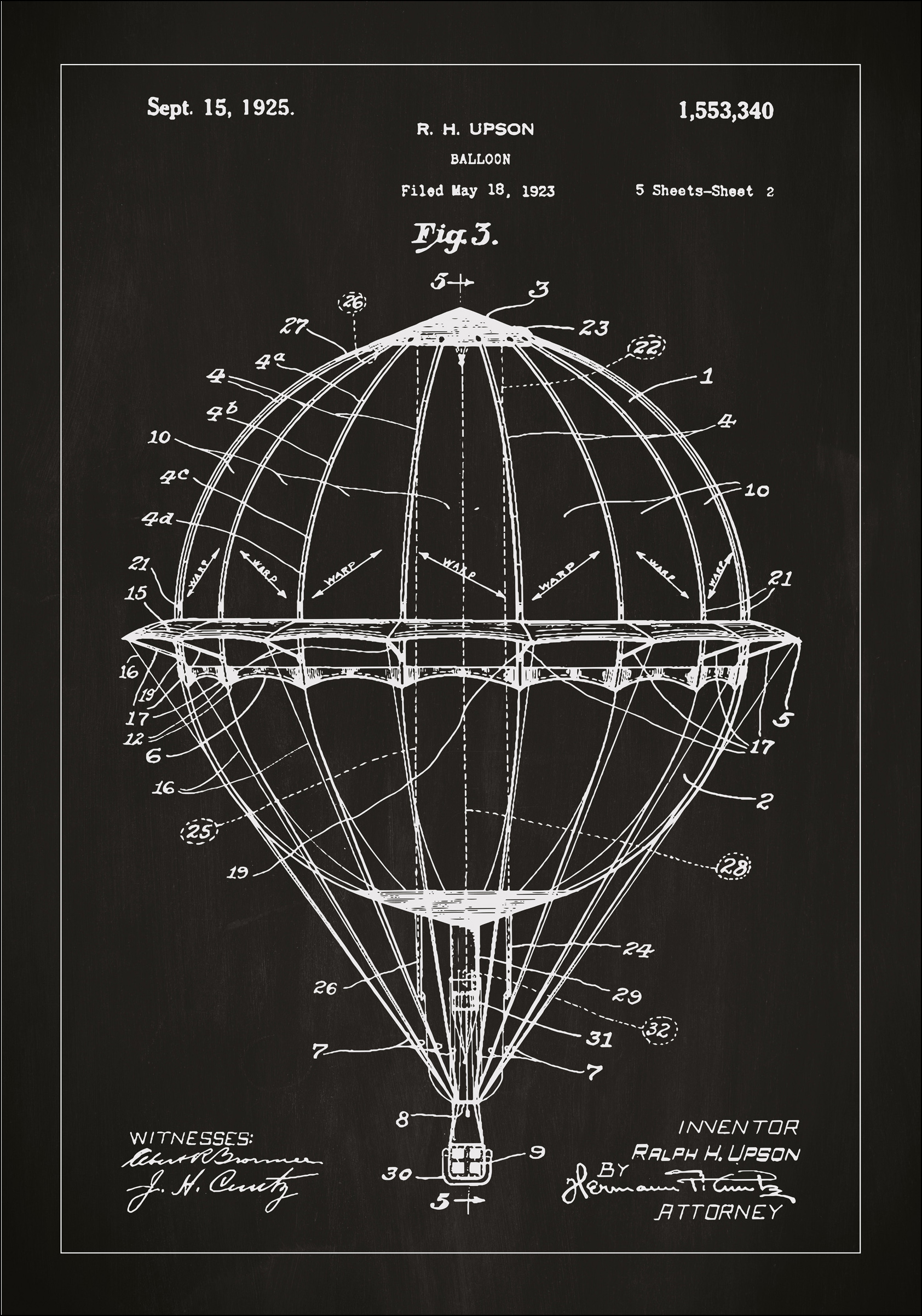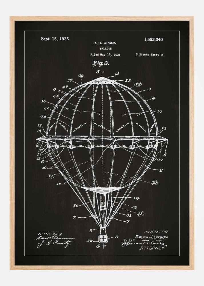 Cette affiche de brevet fabriquée de manière unique illustre une construction détaillée d'une montgolfière, dont le brevet original a été créé par l'innovateur Ralph H. Upson. Brevetée le 15 septembre 1925 sous le numéro 1,553,340, c'est un exemple fascinant de l'ingénierie aérodynamique précoce. Cette affiche de brevet est un hommage au rêve de flotter parmi les nuages et à la quête de l'humanité pour explorer le ciel.