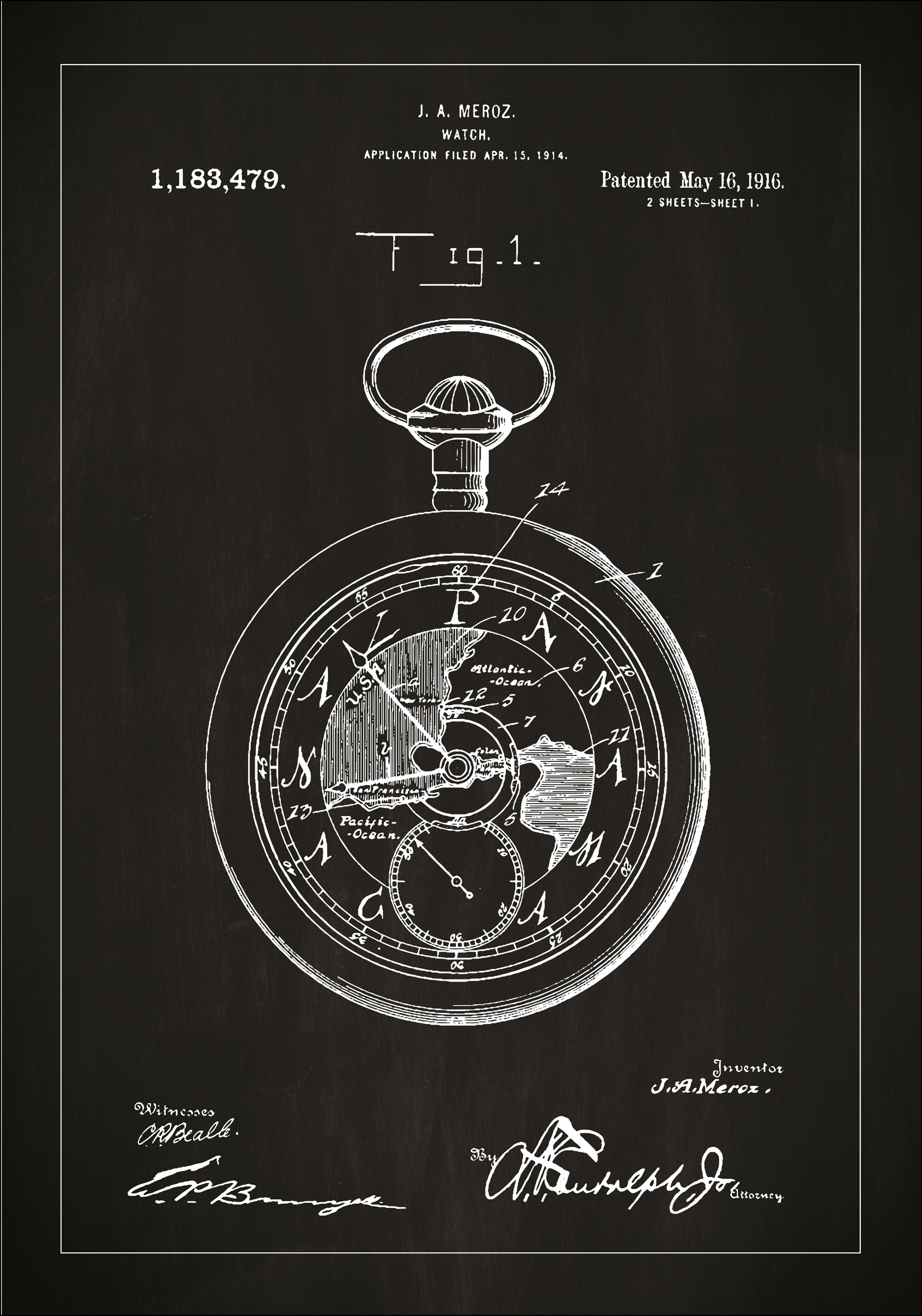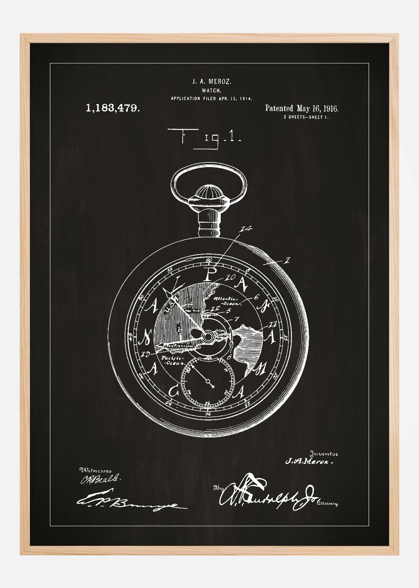 Ce poster sophistiqué de brevet représente l'invention intemporelle d'une montre de poche, brevetée par J.A. Meroz le 16 mai 1916, sous le numéro de brevet 1,183,479. Le dessin de brevet détaillé montre un design complexe du mécanisme de la montre, complet avec des détails mécaniques qui reflètent l'époque où la précision de la mesure du temps est devenue un art en soi.