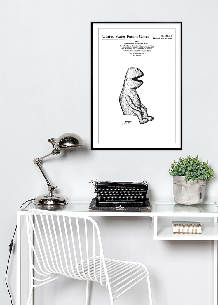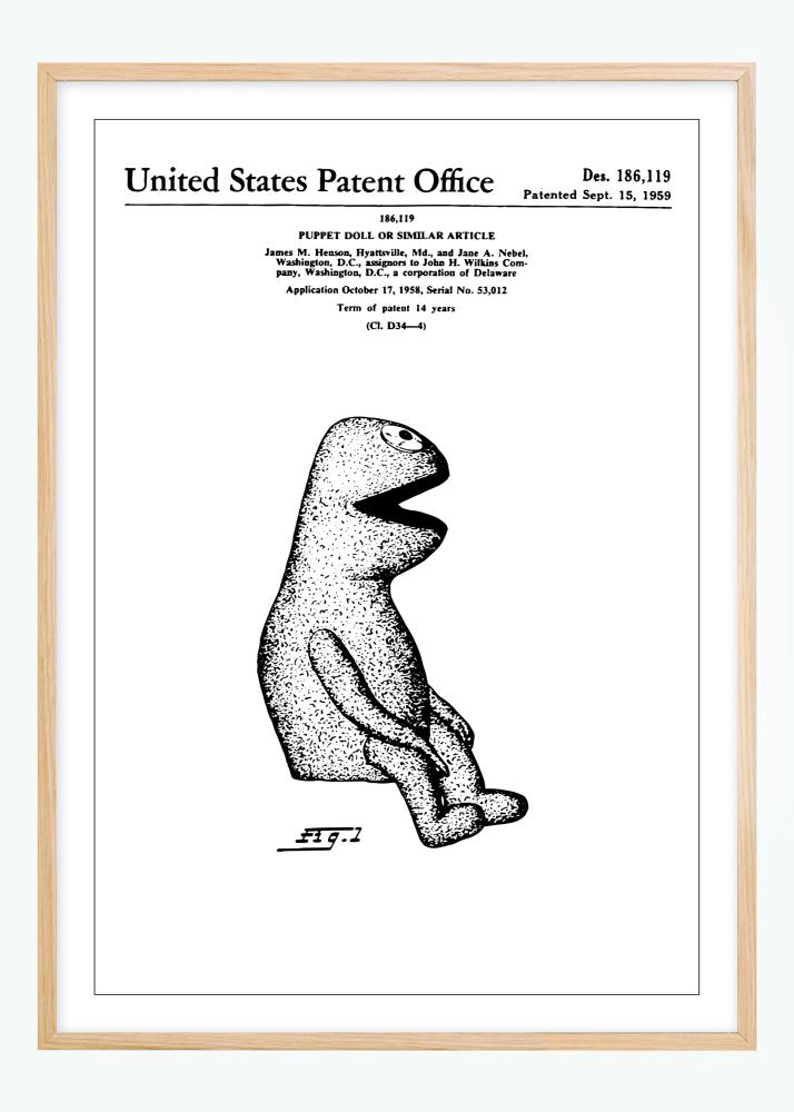 Cette affiche de brevet reproduit le design de Kermit, une pièce d'innovation en matière de jouets qui a été officiellement documentée le 15 septembre 1959 sous le numéro de brevet Des. 186,119. La figure illustrée montre une vue latérale unique de la poupée, qui avec sa forme distinctive et charismatique, offre un aperçu du design de jouets au milieu du XXe siècle. C'était une époque où le design et la créativité commençaient à prendre une plus grande importance dans l'industrie du jouet, dont cette poupée est un exemple.