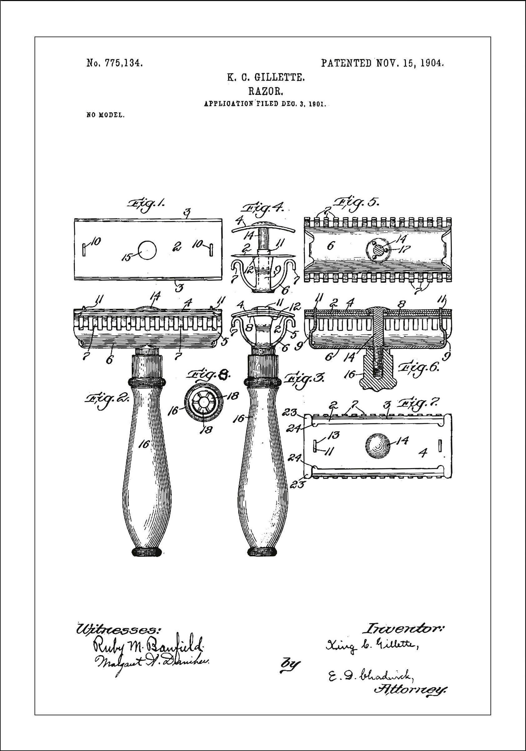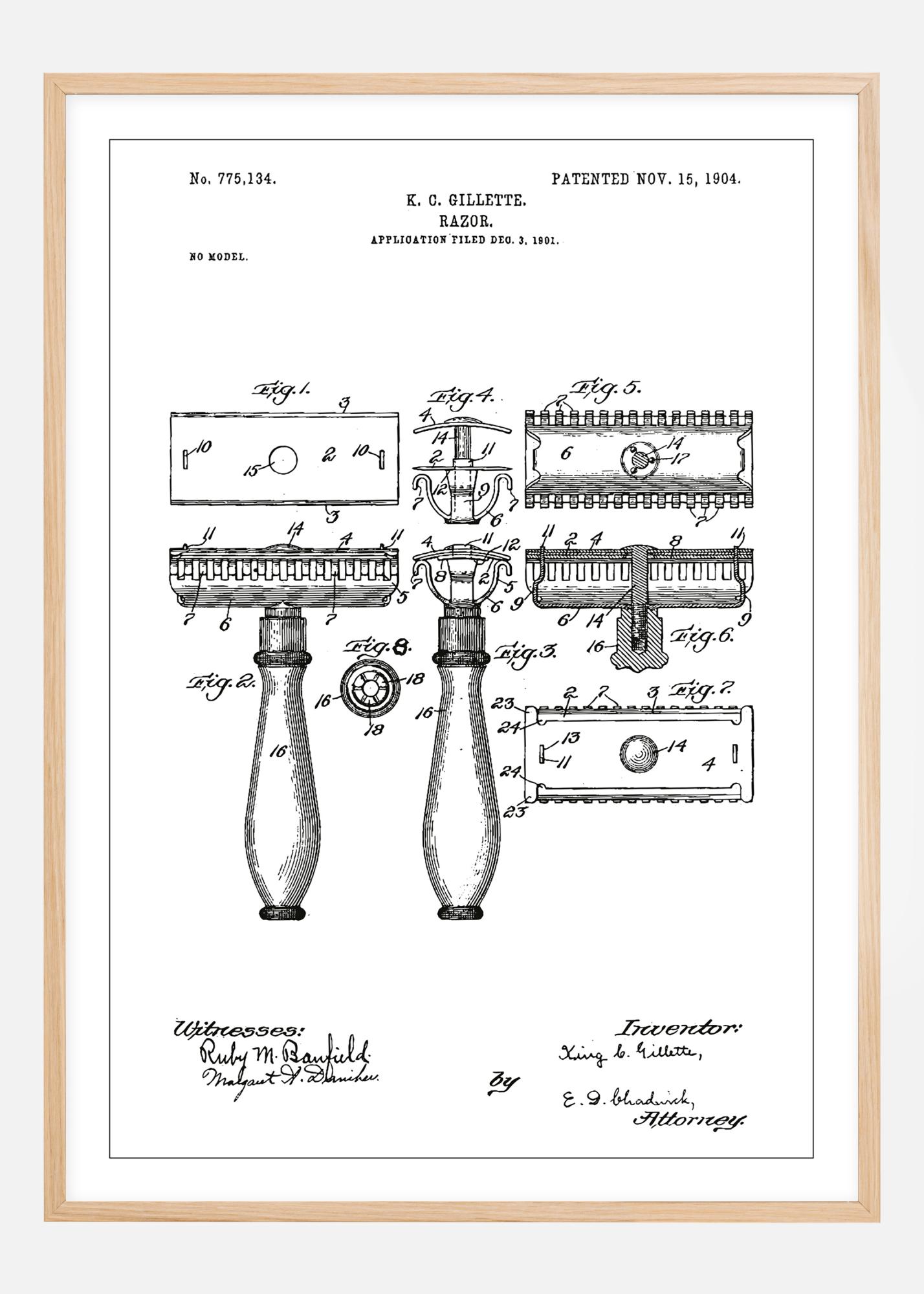 Avec un design iconique et épuré, cette affiche de brevet présente la création révolutionnaire de K.G. Gillette : le rasoir, breveté le 15 novembre 1904, numéro de brevet 775,134. Les détails de ce dessin de brevet soulignent les aspects mécaniques et la construction innovante qui ont transformé l'hygiène personnelle pour toujours, et cela a été documenté pour la première fois en décembre 1901.