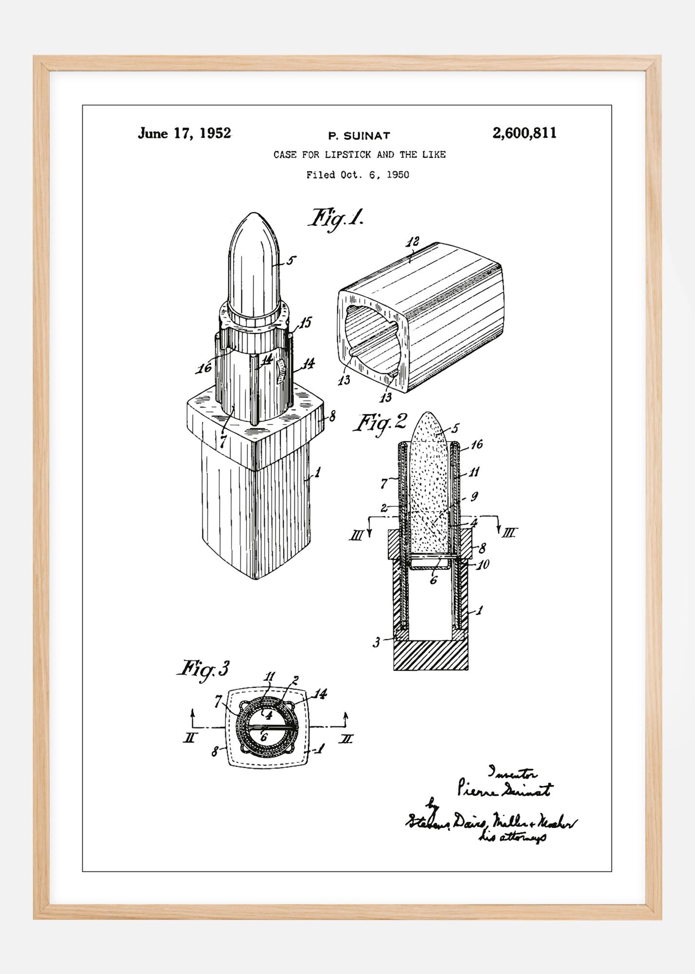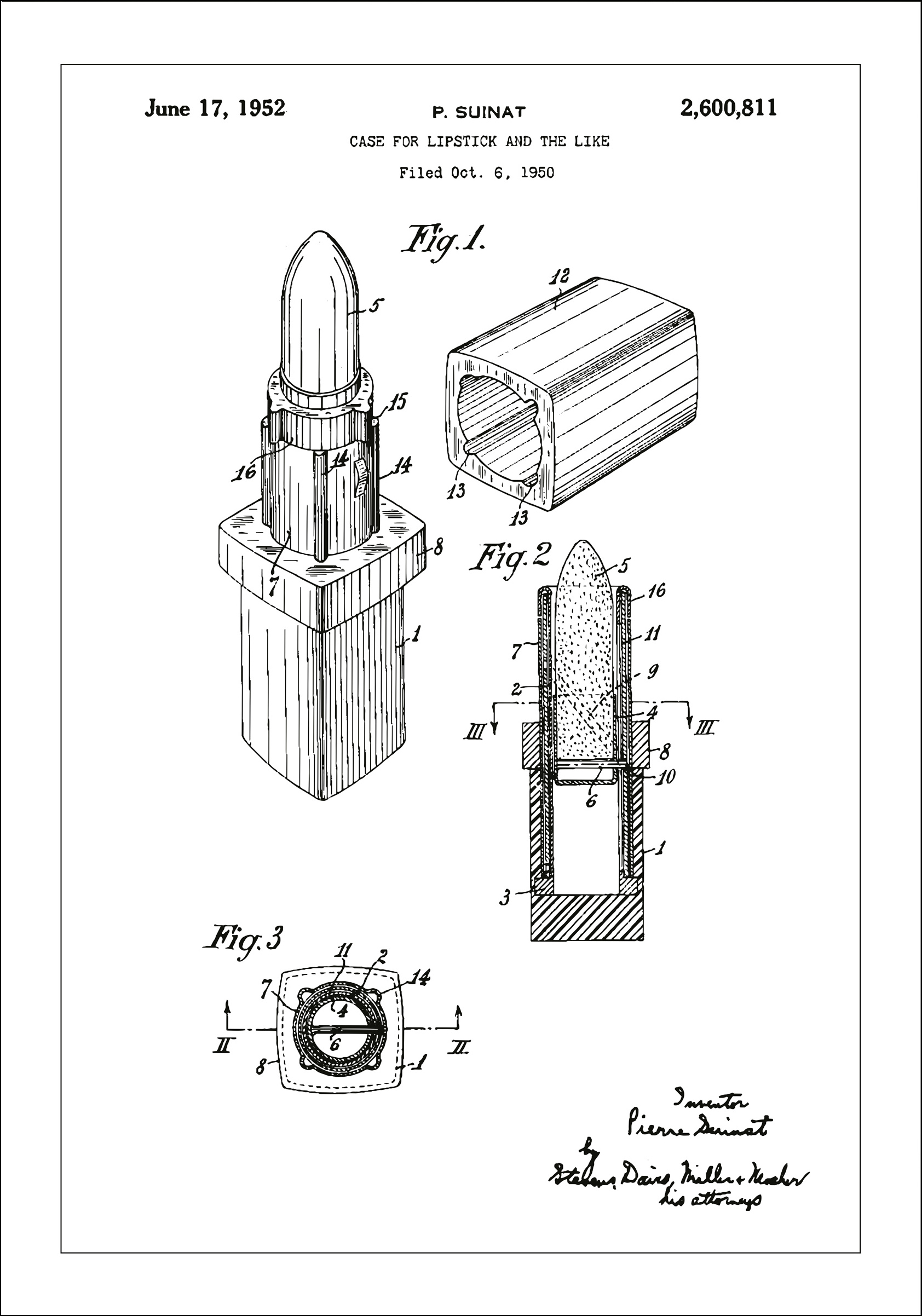 Cet élégant poster de brevet représente le design innovant d'un étui à rouge à lèvres, attribué à P. Suinat sous le numéro de brevet 2,600,811 le 17 juin 1952, après une demande déposée le 6 octobre 1950. L'illustration détaillée montre un design classique d'accessoire de beauté, offrant un aperçu du développement technique et esthétique de l'industrie cosmétique. Les lignes épurées du poster et sa représentation soignée en font un élément de décoration parfait pour les salons de beauté, les studios de maquillage ou comme une œuvre d'art murale unique pour tous ceux qui apprécient les accessoires de beauté vintage et le design.
