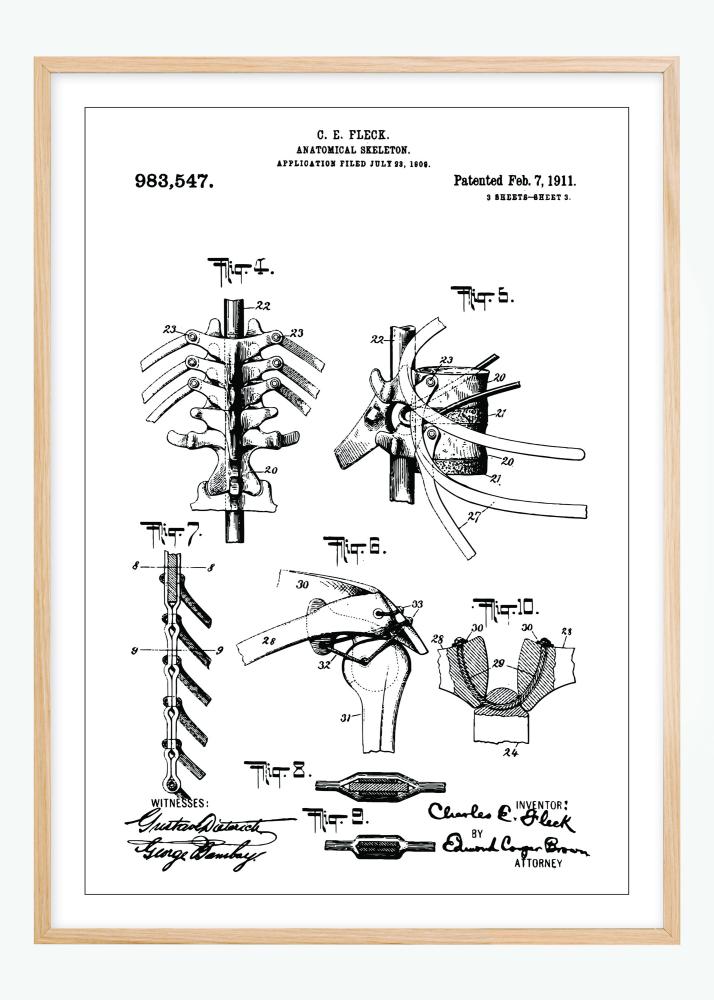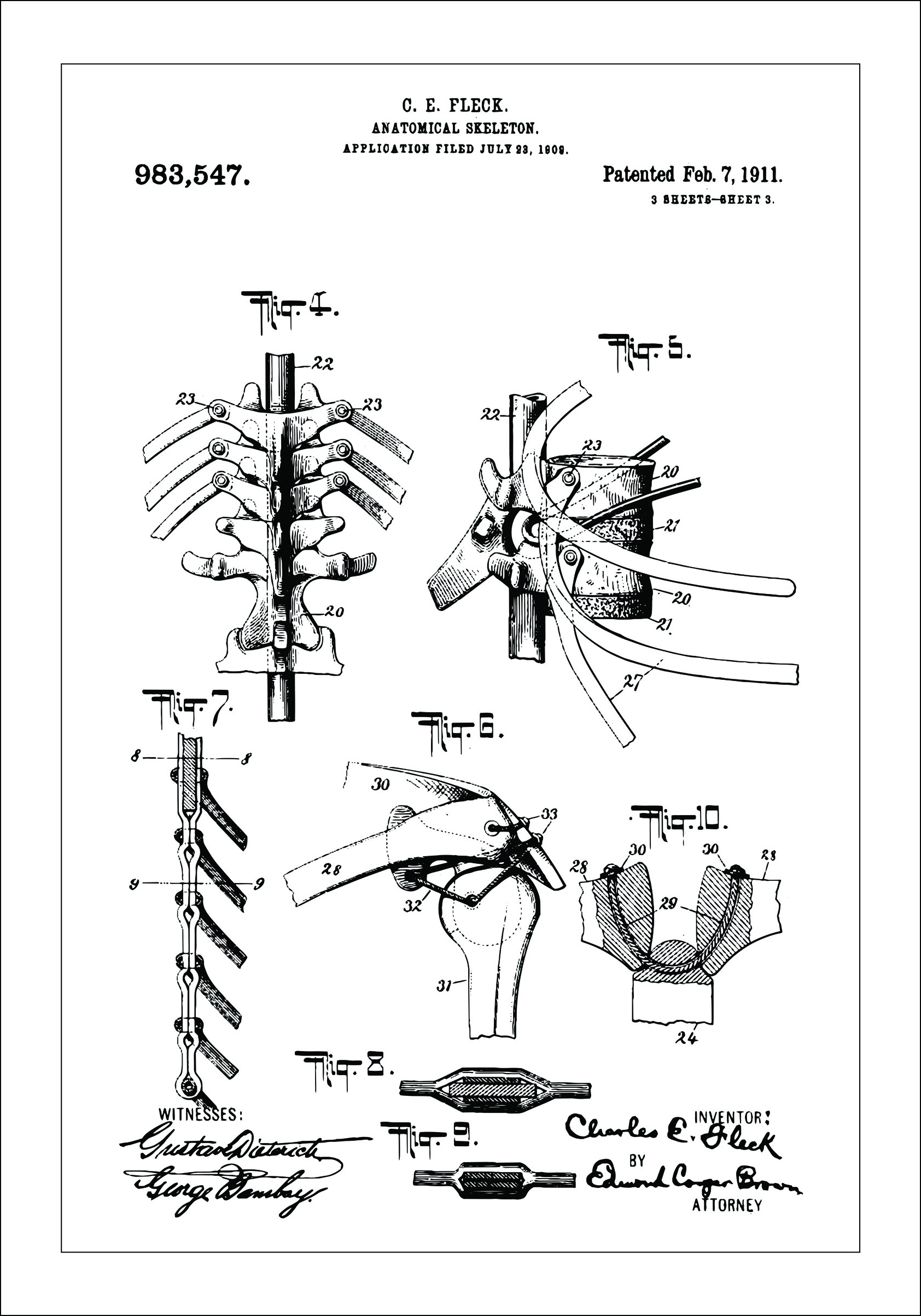 Cette affiche brevetée représente une construction squelettique anatomique, brevetée par C.E. Fleck le 7 février 1911 sous le numéro de brevet 983,547. L'illustration montre des parties détaillées de la structure osseuse, y compris la colonne vertébrale et d'autres parties du squelette humain, avec différents mécanismes pour démontrer le mouvement et la composition des structures osseuses.