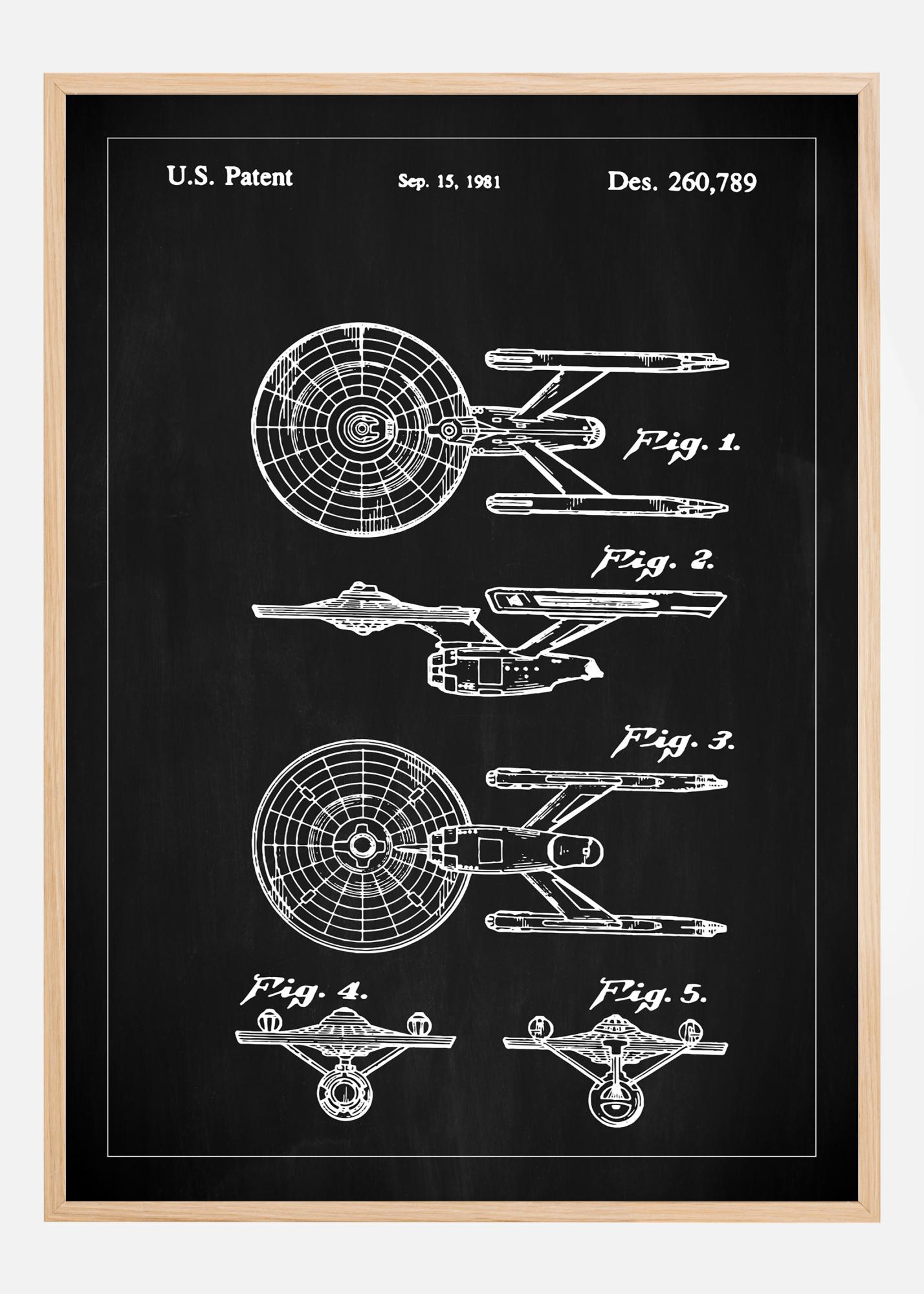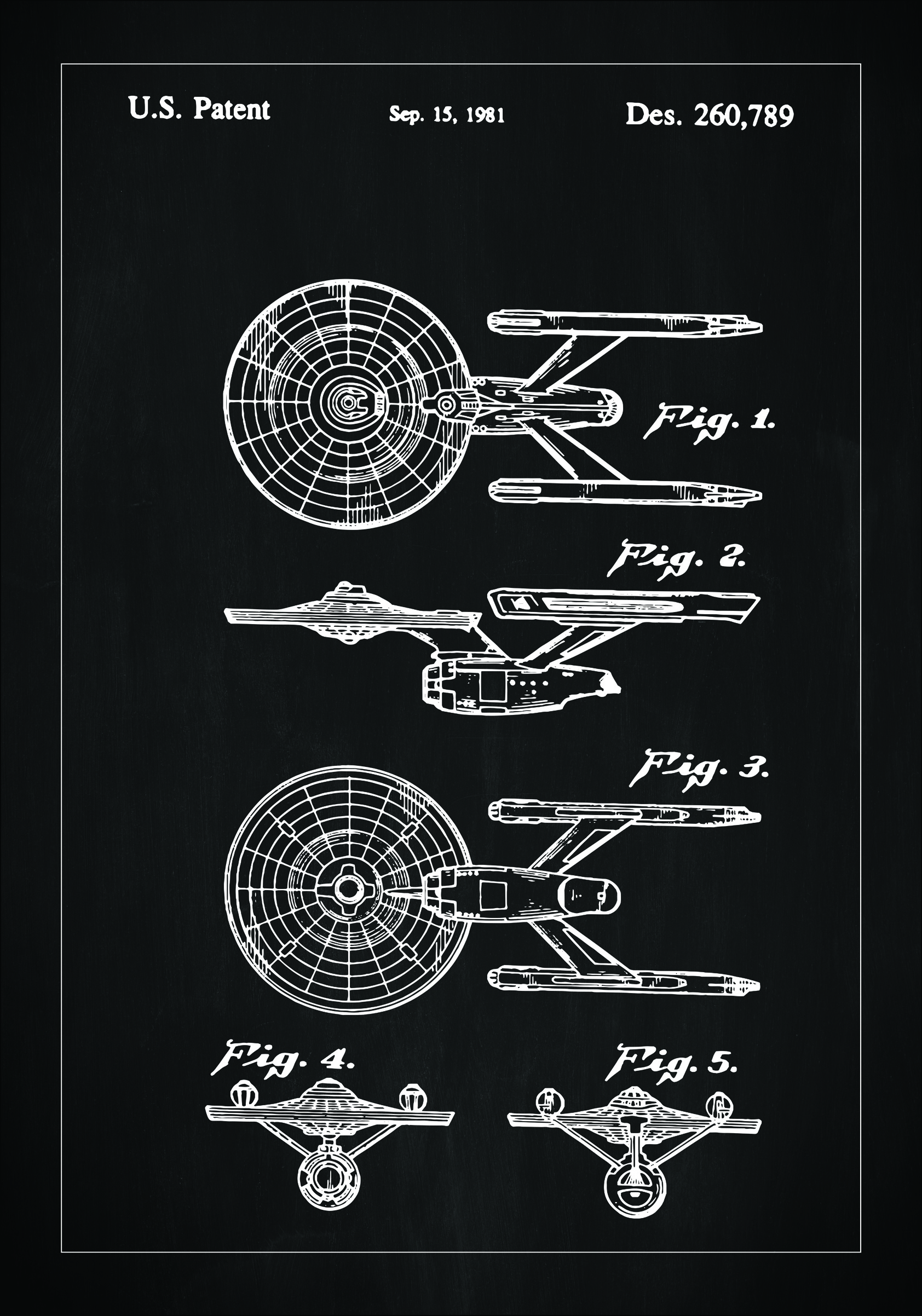 Cette affiche de brevet présente un concept de design iconique pour le vaisseau spatial Enterprise de Star Trek, daté du 15 septembre 1981 avec le numéro de brevet Des. 260,789. C'est une représentation stylisée qui évoque des aventures de science-fiction et des voyages interstellaires. Les illustrations détaillées reproduisent la forme du vaisseau sous différents angles et perspectives, mettant en valeur à la fois sa symétrie et ses structures complexes. Ce dessin de brevet combine merveille scientifique et plaisir esthétique, et c'est un excellent sujet de conversation qui ajoute une touche d'innovation et d'optimisme pour l'avenir à n'importe quel environnement.