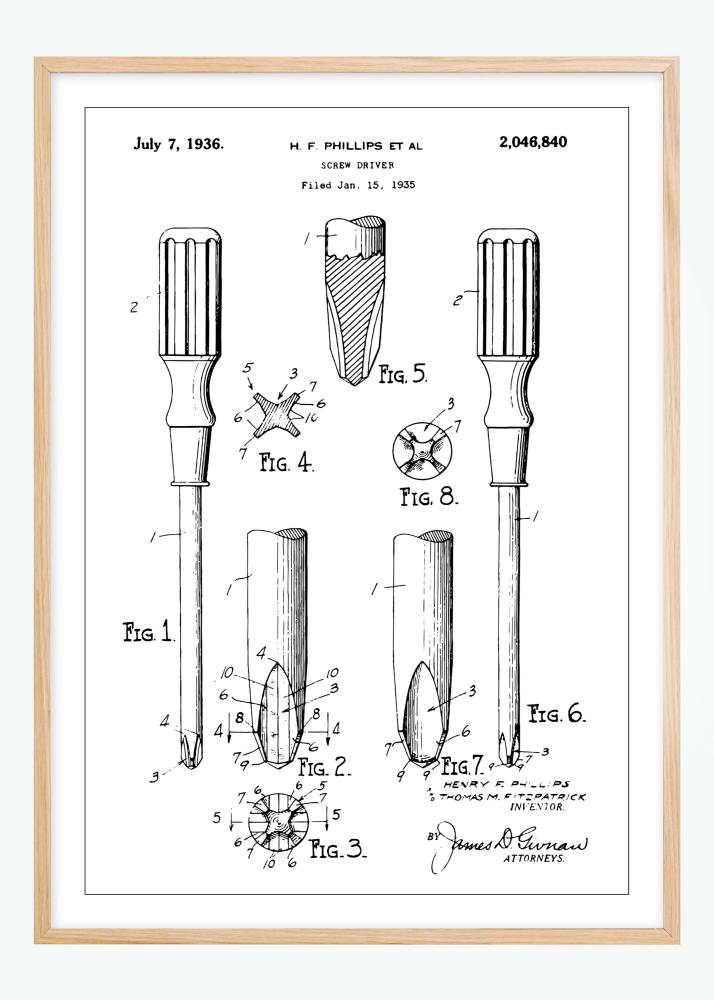 Présenté ici est une affiche de brevet classique illustrant le design d'un tournevis, un outil classique indispensable dans chaque boîte à outils d'artisan. Datée du 7 juillet 1936 et déposée le 15 janvier 1935, cette affiche de brevet montre avec des détails précis la construction et l'innovation derrière l'outil, depuis son manche emblématique jusqu'à la forme unique de sa pointe. Les inventeurs H.F. Phillips et d'autres ont, avec ce brevet, numéro 2,046,840, créé une norme dans l'industrie de l'outillage sur laquelle nous comptons encore aujourd'hui.