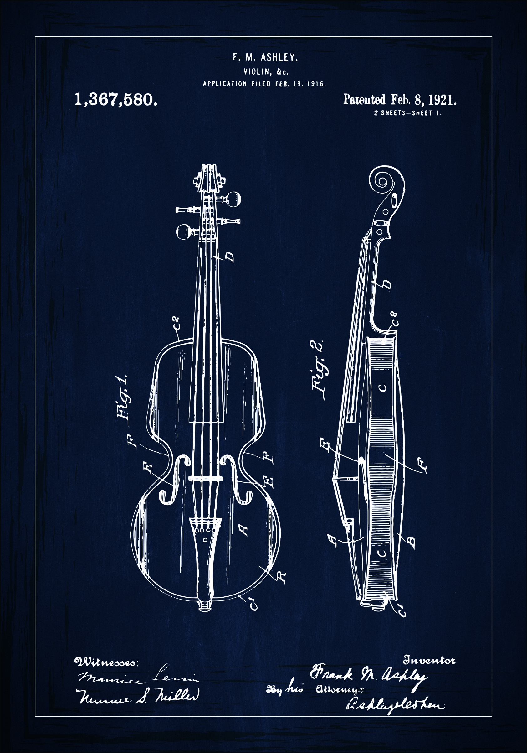 Cet audacieux et distinctif poster de brevet est une représentation du brevet numéro 1,367,580, accordé le 8 février 1921 à F. M. Ashley pour un violon, présenté sur un fond bleu marine sophistiqué. Avec ses illustrations aux lignes blanches qui se détachent sur le ton sombre, il offre un contraste qui attire l'œil et rehausse chaque détail de cet instrument à cordes, de la volute au cordier.