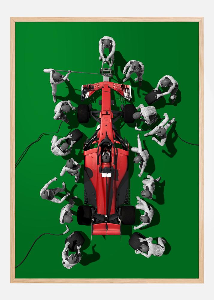 Avec une explosion de couleurs et d'action, cette affiche captivante offre un aperçu du monde plein d'adrénaline de la Formule 1. Sur un fond vert audacieux, la scène emblématique d'un arrêt au stand est représentée, où une équipe de mécaniciens en argent et blanc travaille en parfaite synchronisation autour d'une voiture de course rouge vif. Cette composition contrastée est un hommage à l'art de la vitesse et à la précision du sport automobile.