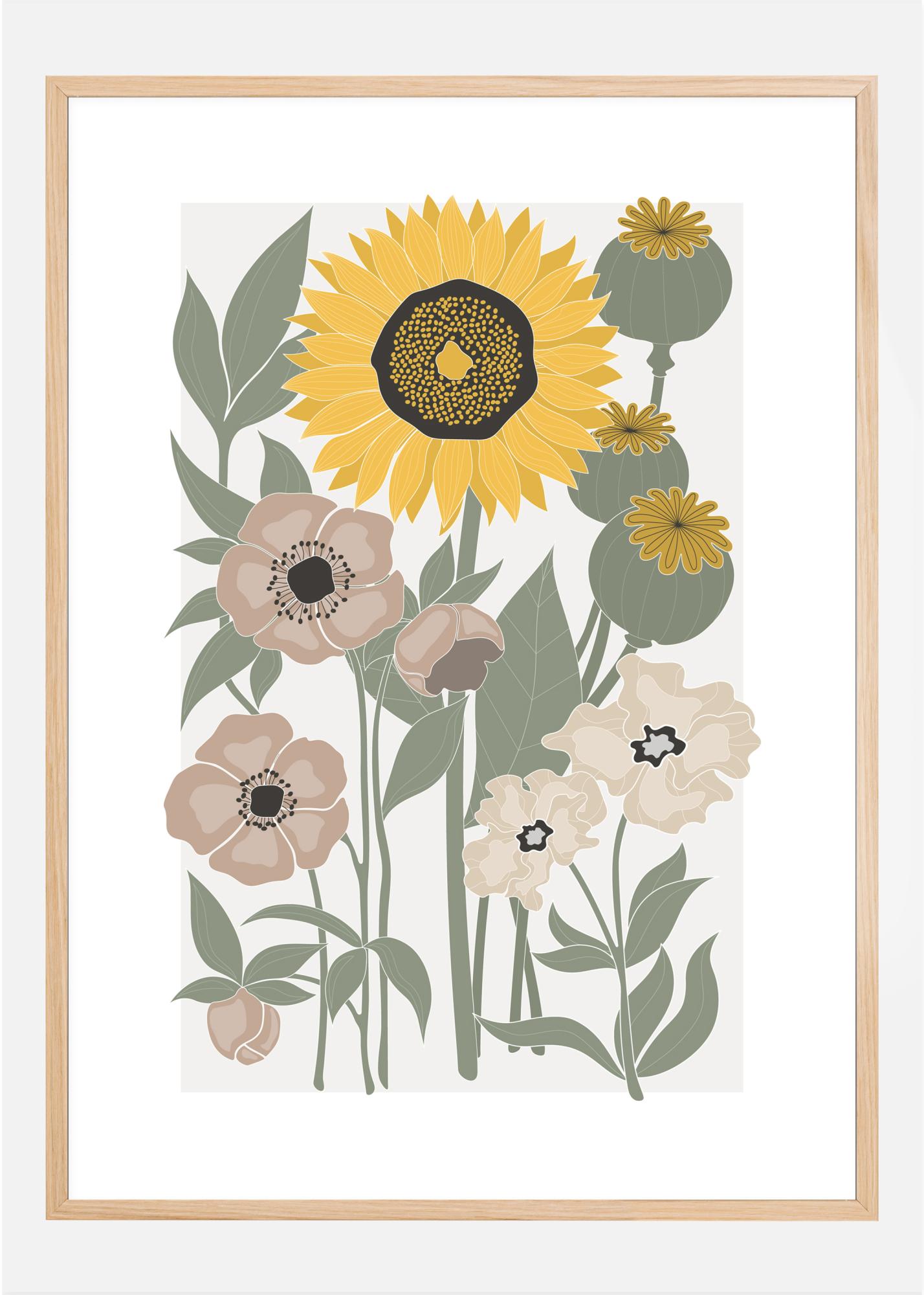 Un poster à l'impression douce représentant diverses fleurs. Un tournesol brillant domine le centre de cette affiche de jardin avec d'autres fleurs, comme les coquelicots. Cette impression simple permet de voir facilement les détails et d'apprécier cette affiche ensoleillée.