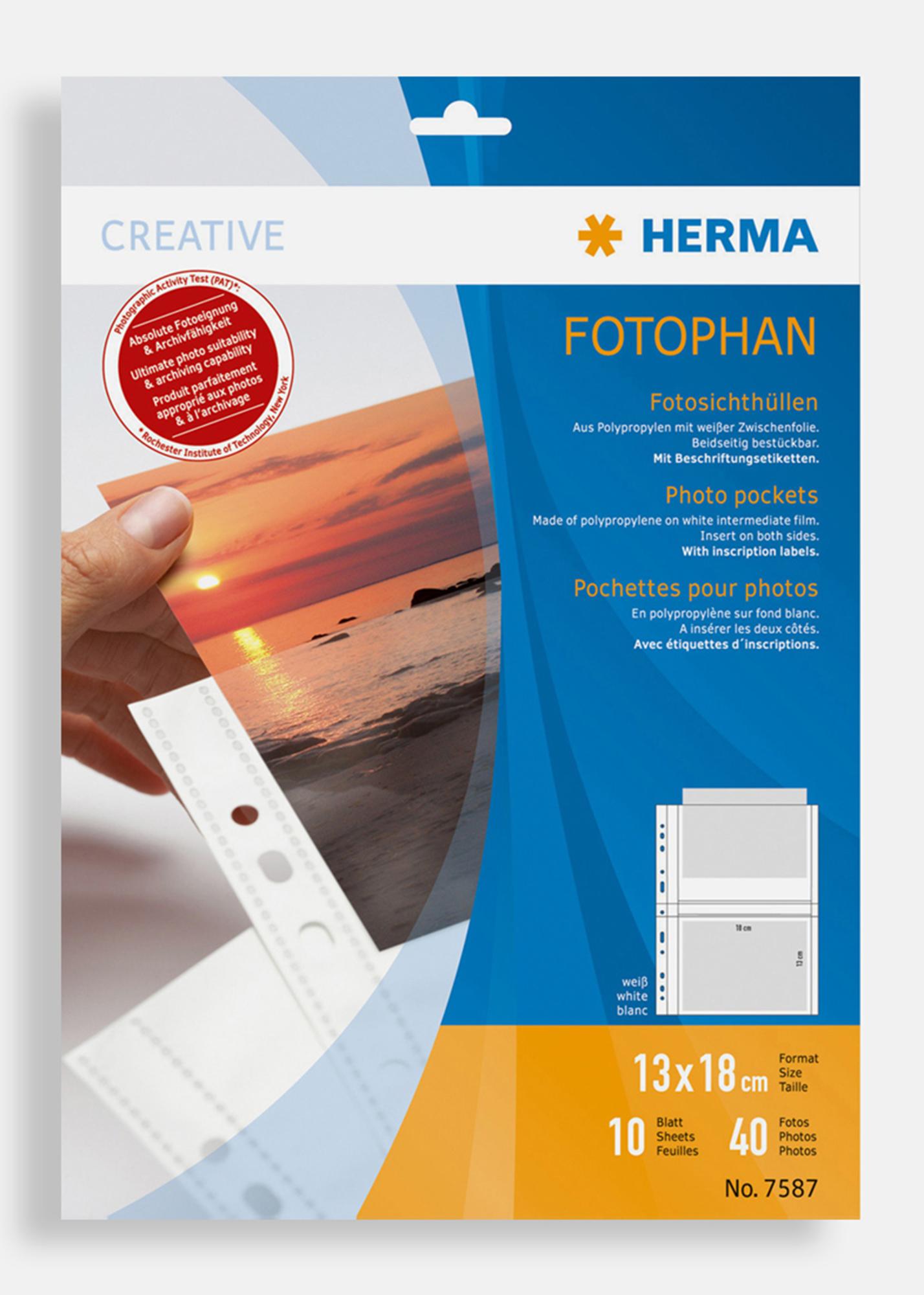Pochettes photo blanches double face pour images au format 13x18 cm (format paysage) toutes les pochettes photo Herma sont toujours sans acide et garanties sans danger pour vos photos. Les pochettes photo sont adaptées pour être placées dans des classeurs à anneaux de format standard. Les pochettes photo sont sans PVC.