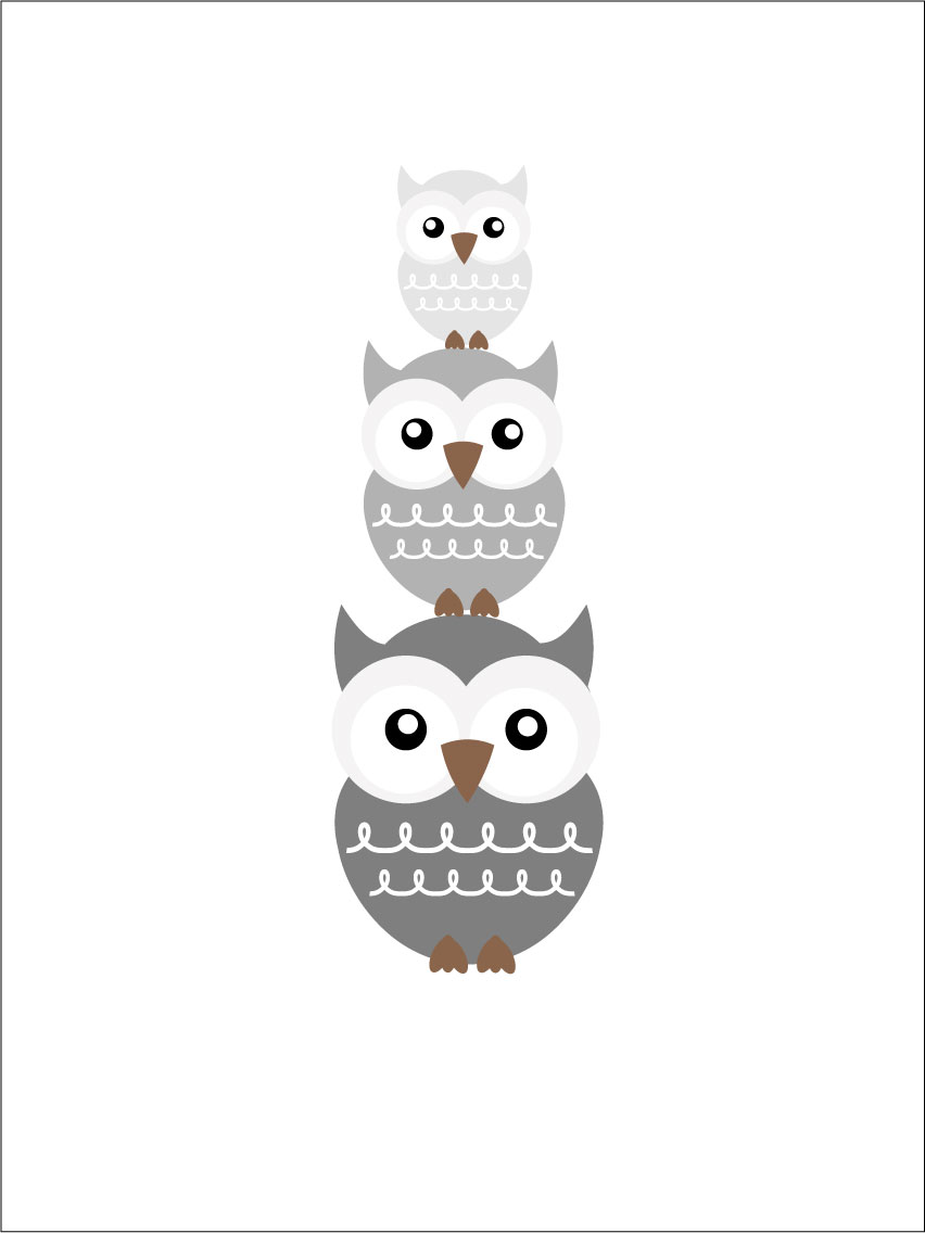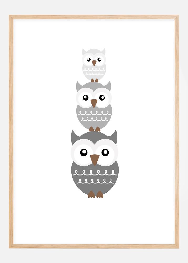 Trois c'est mieux qu'un. Art mural avec le numéro un des oiseaux d'intérieur, le hibou. L'illustration de trois hiboux gris foncé stylisés empilés les uns sur les autres sur un fond blanc est devenue un classique moderne. Le motif convient aussi bien au salon qu'à la chambre d'enfant et se marie particulièrement bien avec un intérieur qui reprend la couleur de la peinture. Combinez avec d'autres oiseaux ou animaux pour une sensation sauvage.