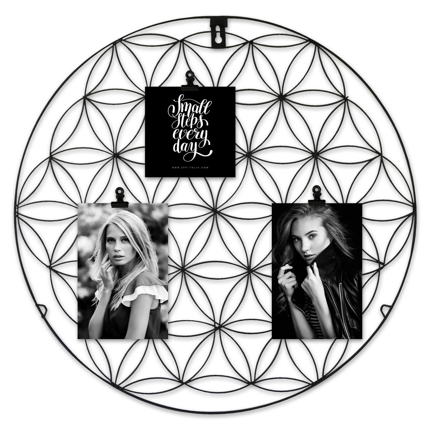 Voici un superbe cadre rond en métal noir. Le cadre multivues mesure diamètre 50 cm et les images se retrouvent accrochées à l'aide de pinces, sur un arrière-fond dotés de motifs décoratifs. Puisque vous attachez les images avec des pinces, vous pouvez choisir d'accrocher des images de différentes tailles afin de créer une sensation esthétique et légèrement dynamique. Ce cadre multivues rond en métal peut être joliment disposé dans la maison pour apporter un détail accrocher, mais il peut également être offert en guise de joli cadeau à une autre personne !
