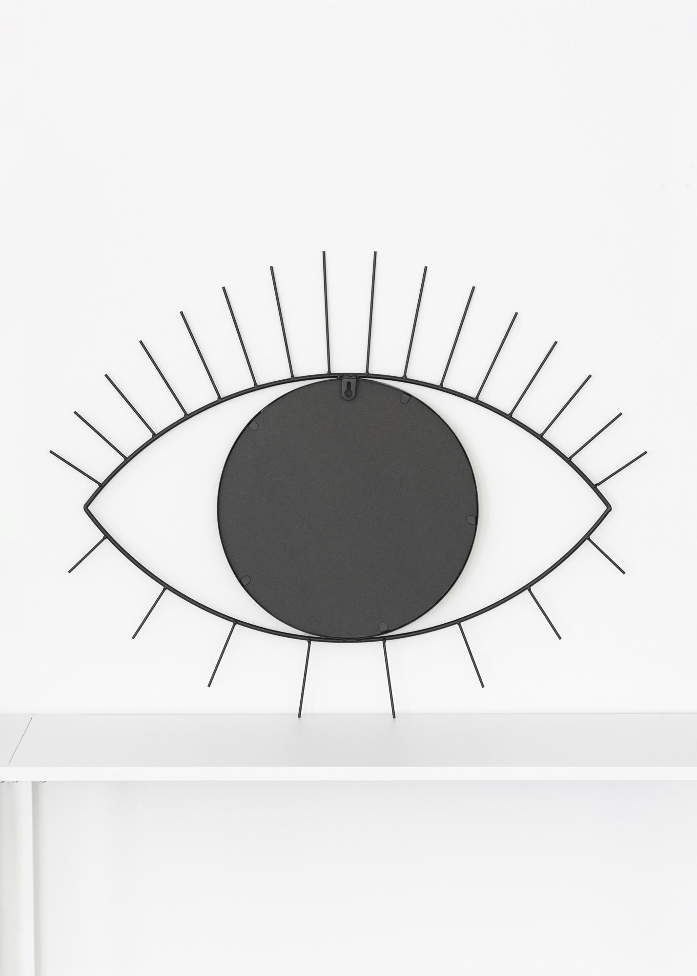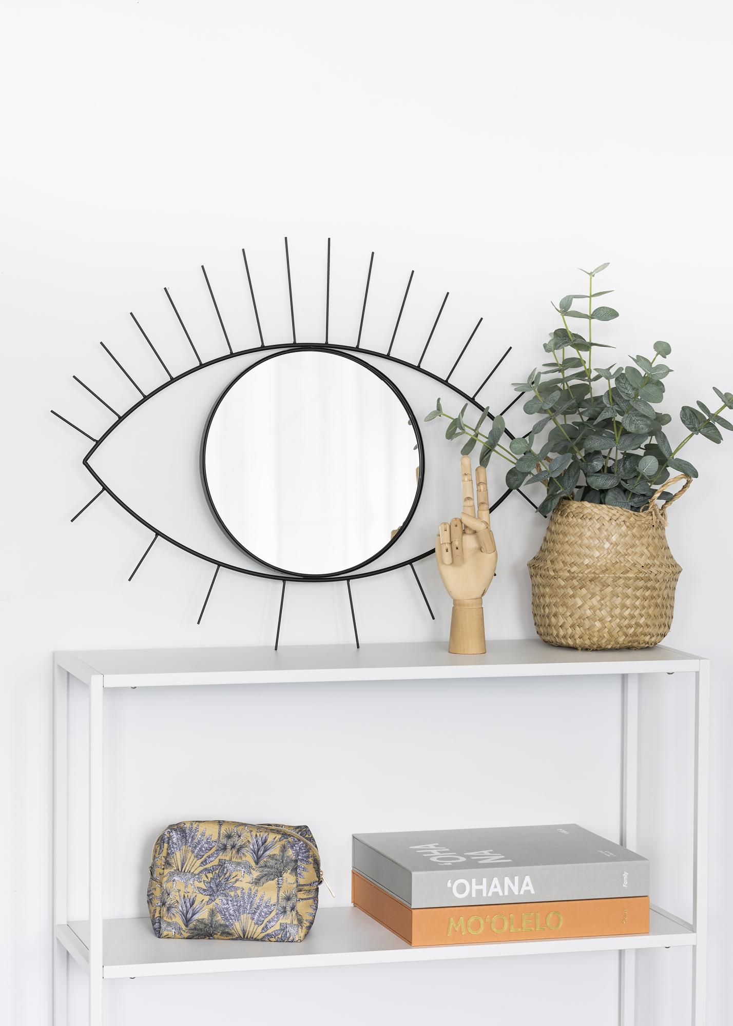 Voici un miroir mural au design vraiment unique qui attirera l'attention dans votre foyer ! Ce miroir mural a un design qui imite un œil et des cils en métal sur son pourtour. Le miroir se présente dans une teinte noire esthétique et mesure 55x70 cm. Le miroir a une atmosphère bohème et peut être joliment associé avec des tableaux et autres décorations murales pour créer un joli ensemble.