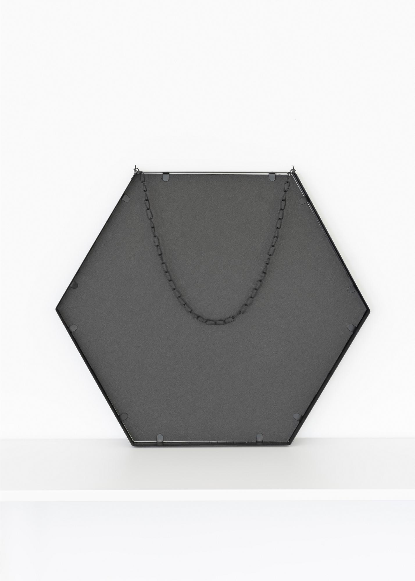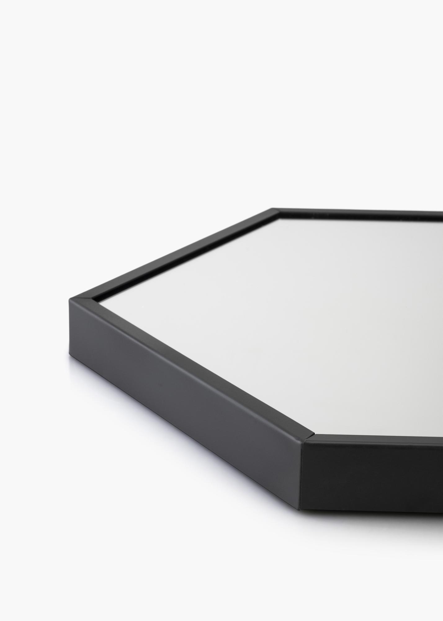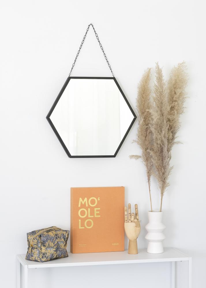 Voici un joli miroir mural de forme hexagonale avec une chaîne décorative permettant de l'accrocher. Le miroir mesure 39x45 cm et il est conçu en métal. Ce miroir-ci s'adapte parfaitement au foyer moderne avec son design angulaire et sa couleur noir.