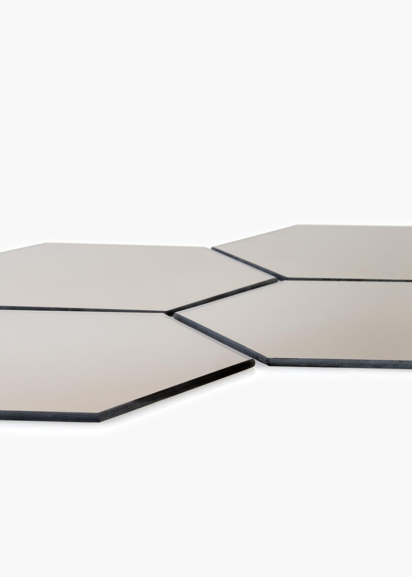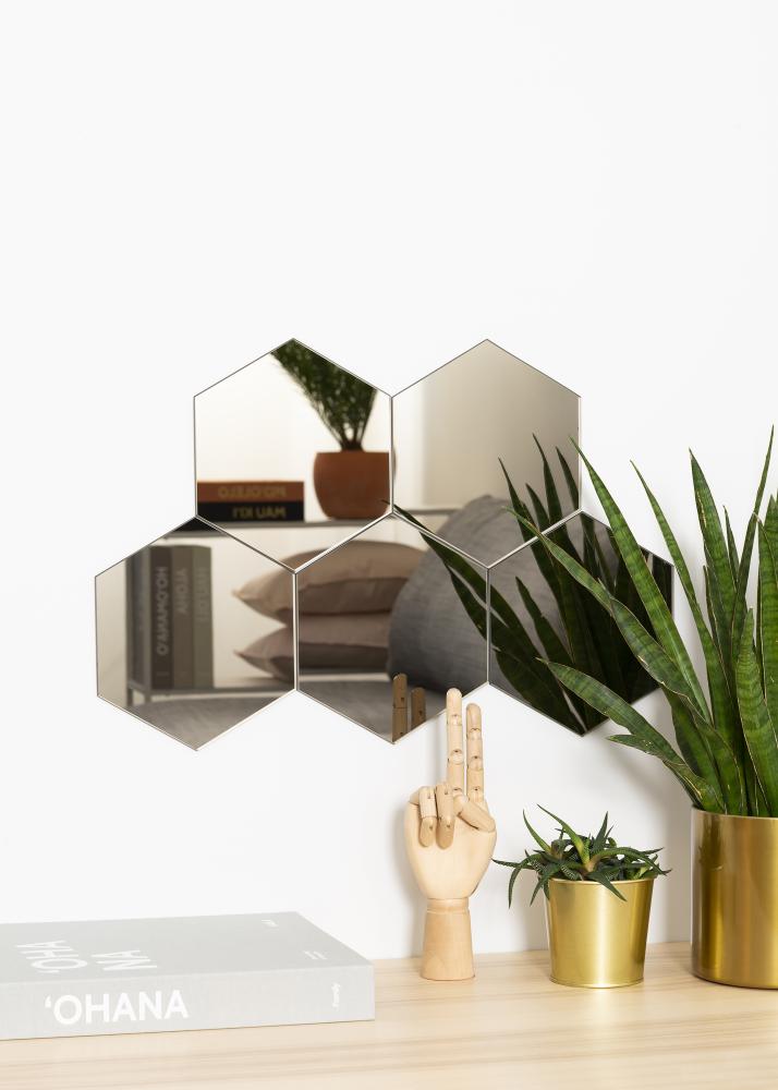 Placez les miroirs à votre guise : ensemble dans un groupe, les uns à côté des autres en rangée ou comme vous le souhaitez. Chaque miroir mesure 18x21 cm, et si vous souhaitez ultérieurement agrandir votre décoration murale, il est facile de compléter avec plusieurs lots de 5. Ces miroirs de forme hexagonale sont également disponibles avec d'autres teintes pour le verre, par exemple or rose ou verre clair. En mélangeant les couleurs, vous créez une décoration de miroirs tout à fait vivante !