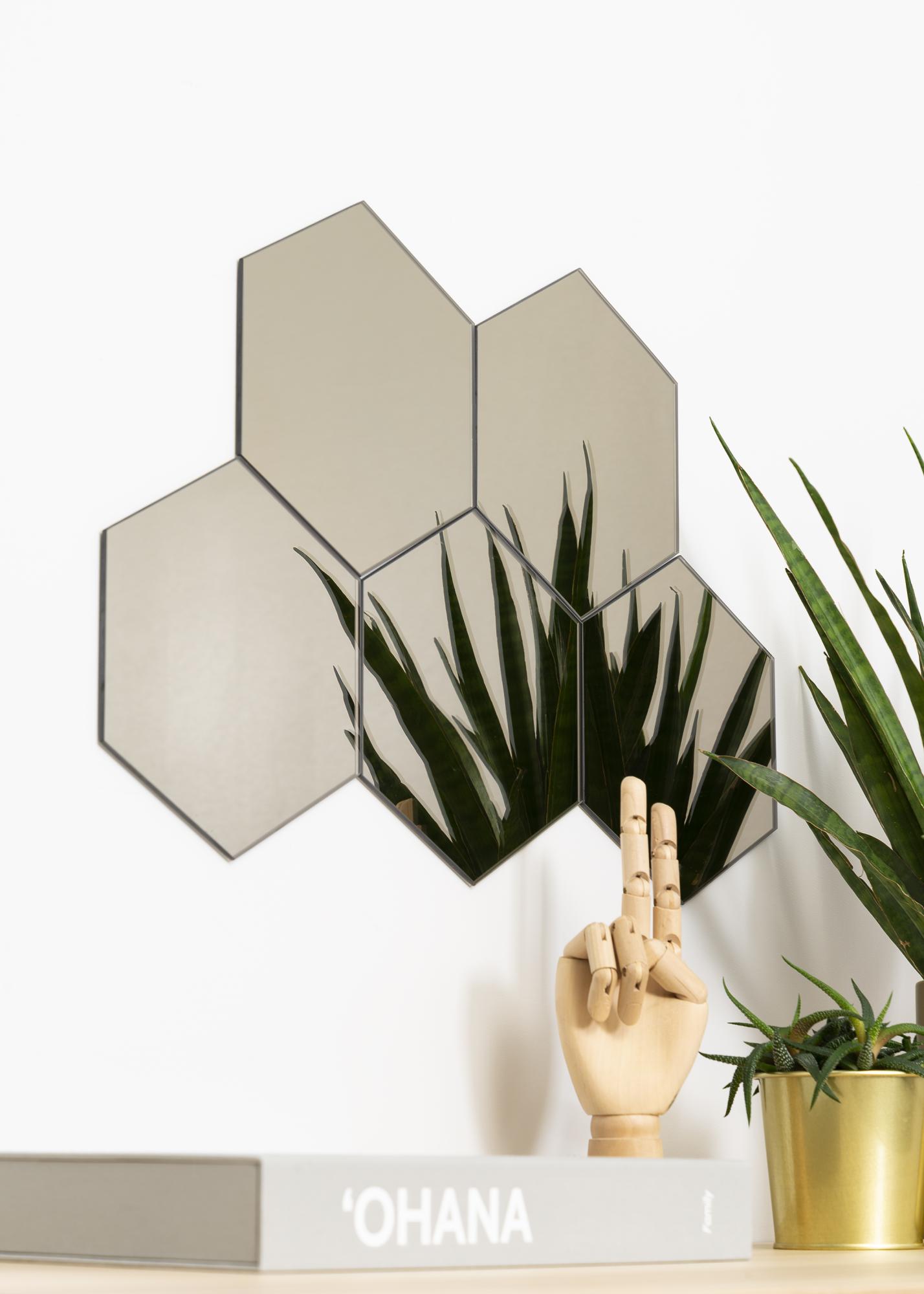 Faites ressortir votre créativité et créez votre propre décoration murale ! Ces miroirs modernes de forme hexagonale sont vendus en lot de 5 et sont livrés avec du ruban adhésif double face pour un montage facile au mur. Les verres miroir sont teintés dans une élégante nuance de bronze foncé, ce qui rend votre décoration murale encore plus tendance, pour un effet assuré !