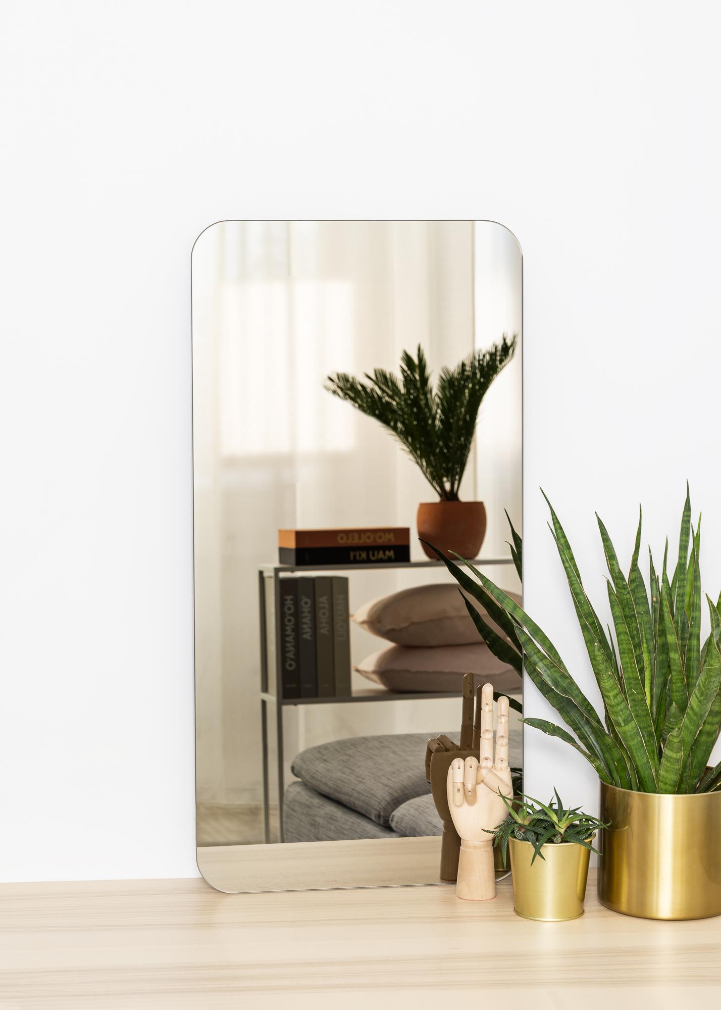 Ce miroir rectangulaire comporte des coins arrondis décoratifs pour une impression de douceur et d'élégance. Le verre du miroir est teinté dans une élégante nuance de bronze foncé, ce qui fait de ce miroir un détail de décoration tendance et à l'effet assuré dans votre maison. Le miroir est également très mince et n'a pas de cadre, ce qui contribue en outre à sa sensation d'élégance et de finesse.
