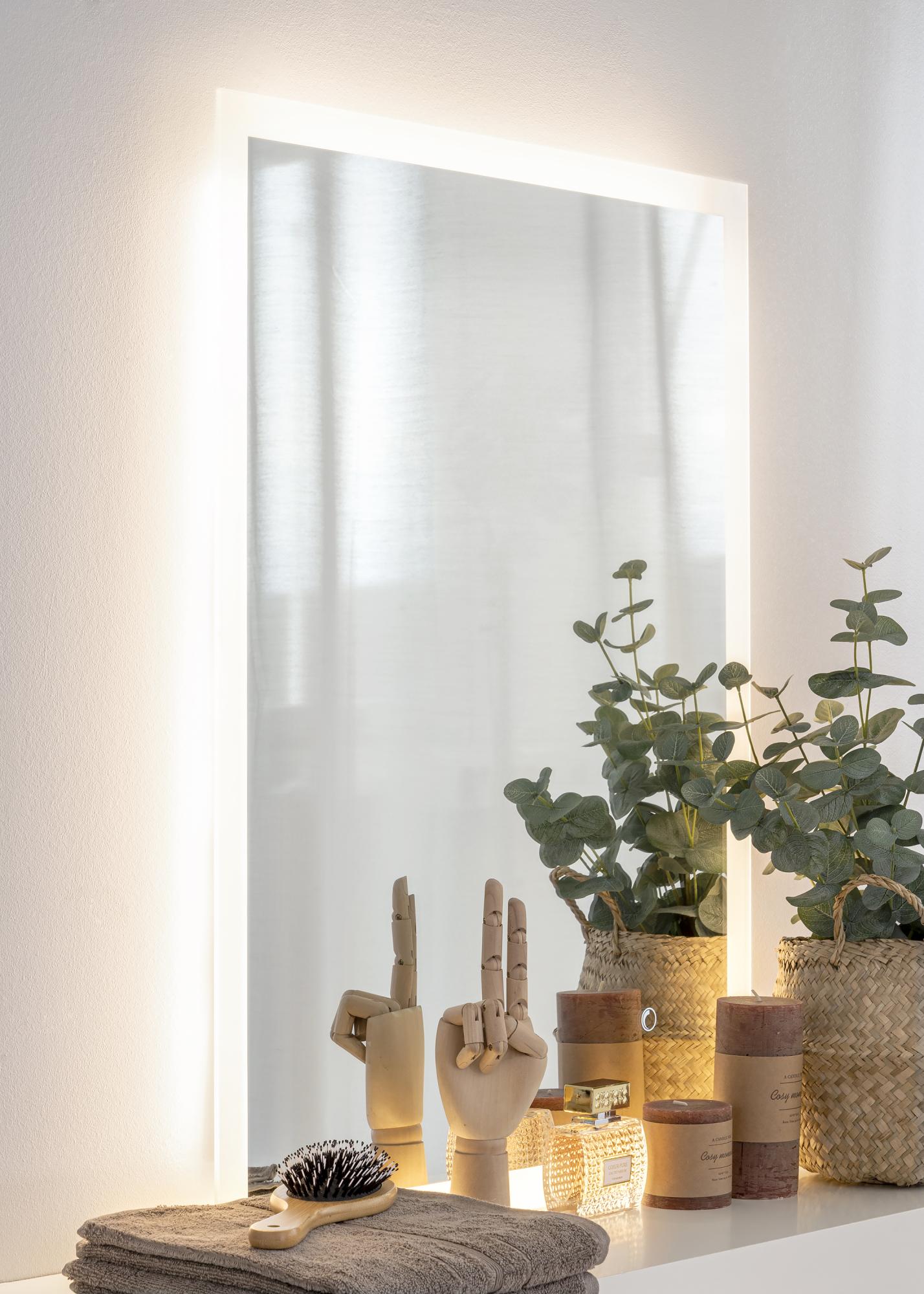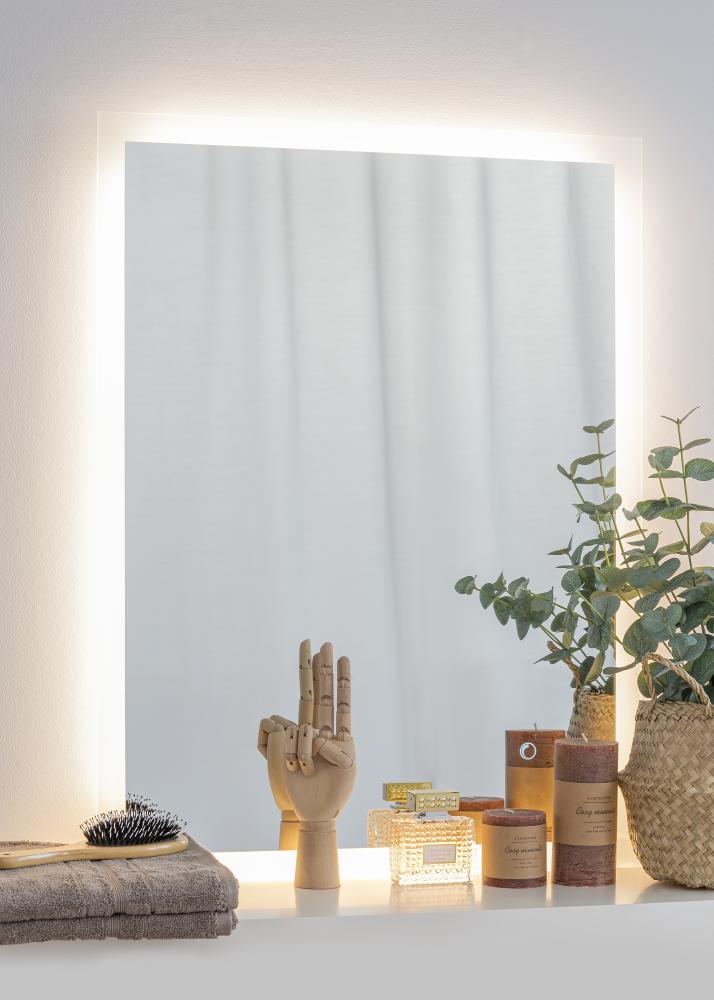 Ce miroir de salle de bain intemporel ne fait que 3 cm d'épaisseur et il mesure 60x80 cm. Le miroir de salle de bain a des supports muraux et il est possible de l'accrocher aussi bien à l'horizontale comme à la verticale. Le miroir est adapté pour les salles de bain mais il convient aussi bien comme miroir de maquillage. Le miroir est destiné à une installation fixe et se connecte à un interrupteur. Afin que le miroir puisse fonctionner correctement, celui-ci doit être connecté à un interrupteur normal et non à un gradateur de lumière.
