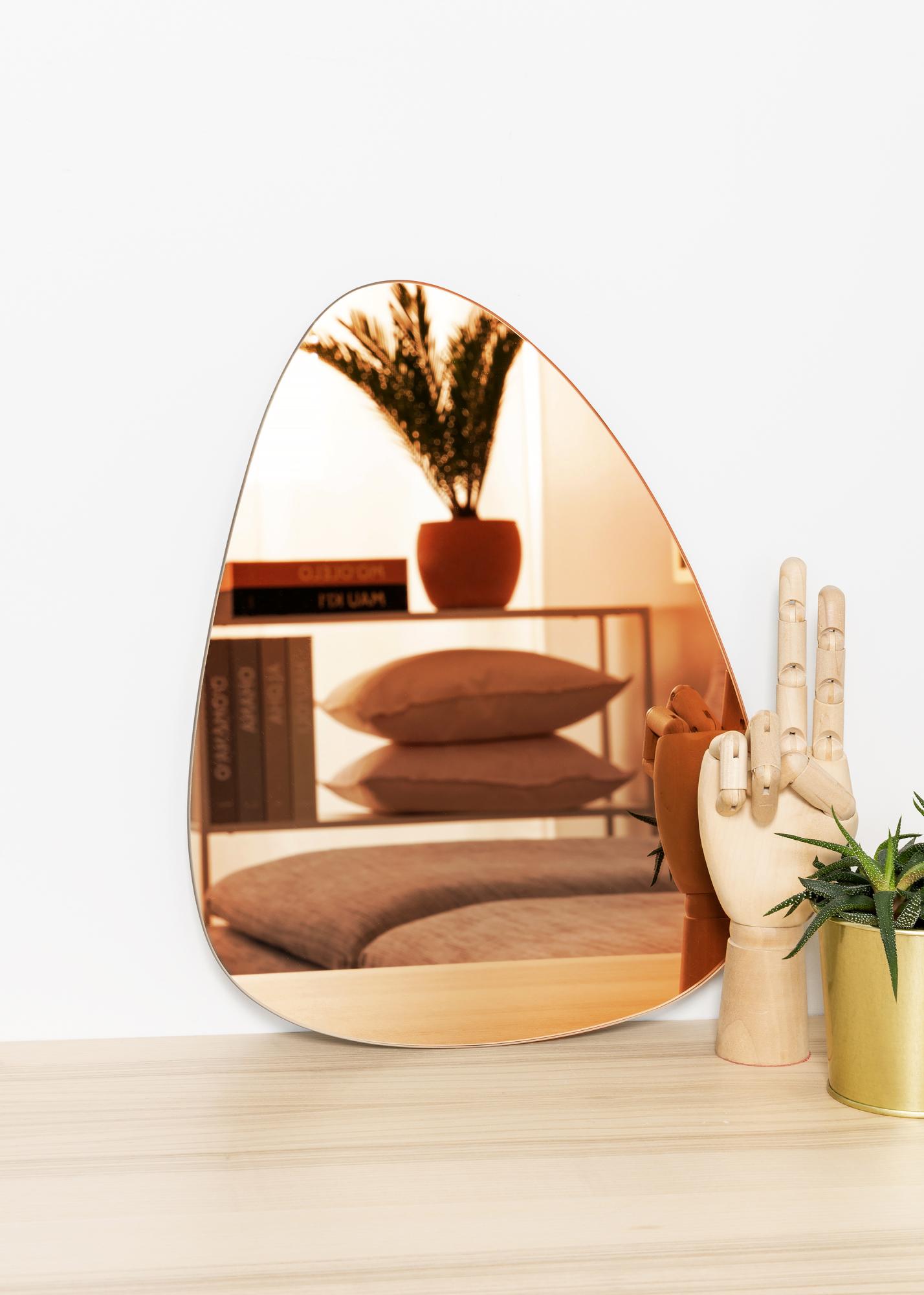 Un miroir asymétrique donne une allure tendance à votre intérieur ! Ce miroir mural décoratif est également très fin, ce qui donne à la forme de miroir moderne et différente une touche d'élégance. Pour rehausser davantage la sensation tendance, le verre miroir a été teinté dans une nuance efficace et chaude d'or rose.