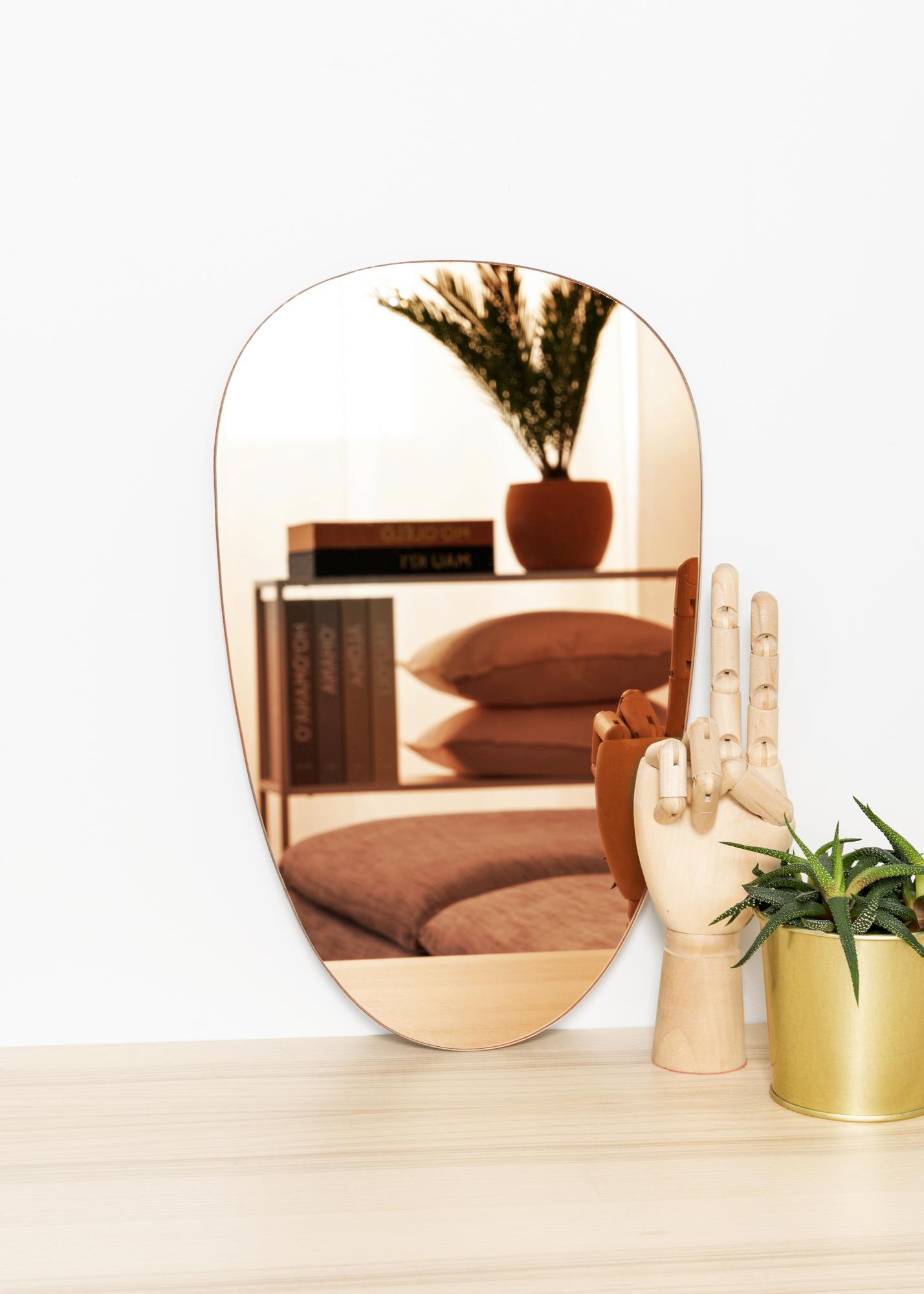 Ce miroir tendance et asymétrique sera un élément charmant de votre décoration intérieure ! La forme douce et presque ovale du miroir lui donne beaucoup d'élégance, qui est par ailleurs amplifiée par le fait que le miroir est très mince et sans cadre. Le verre du miroir a été teinté dans une teinte chaude d'or rose, ce qui donne un bel effet et contribue à l'aspect très moderne du miroir.