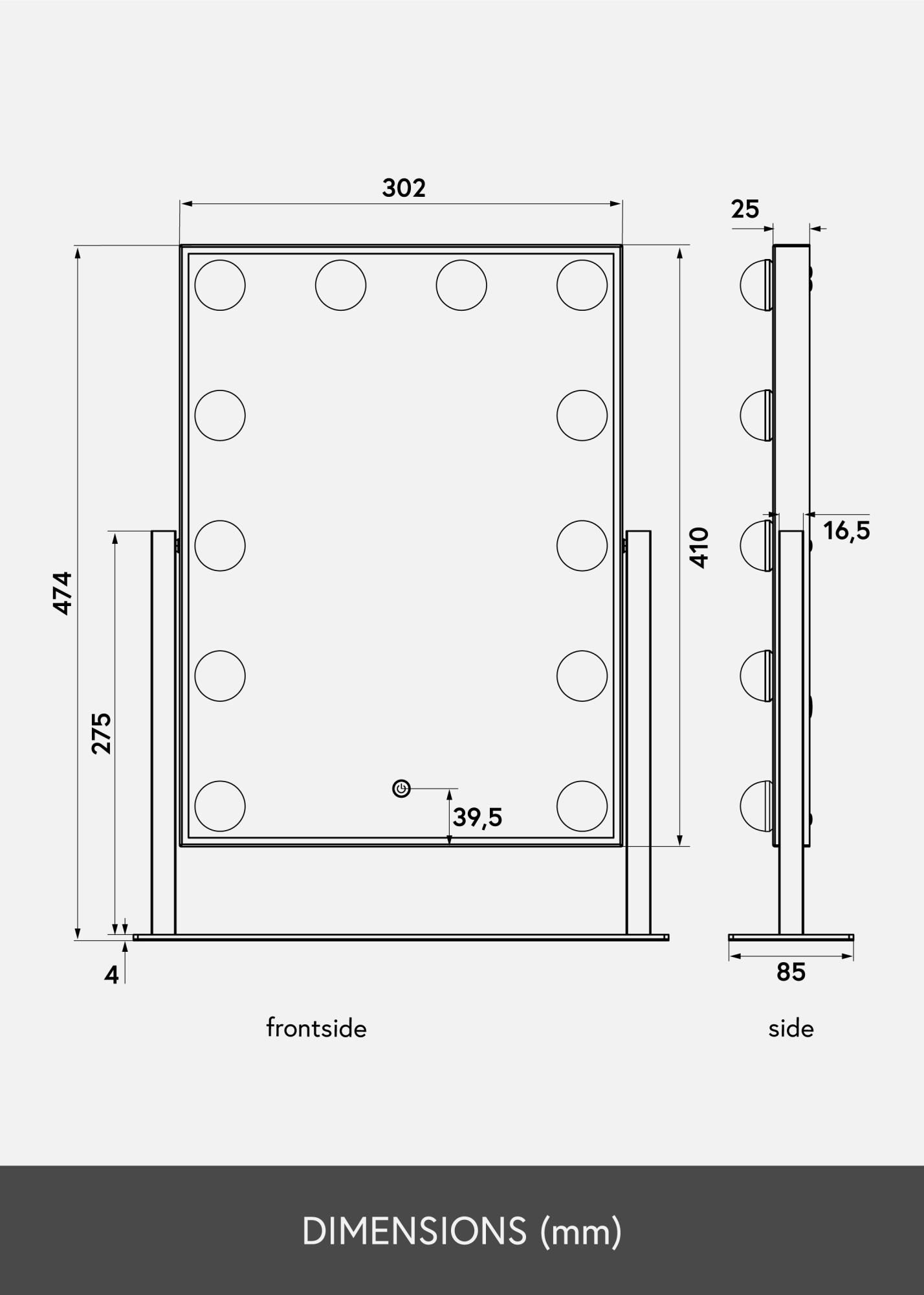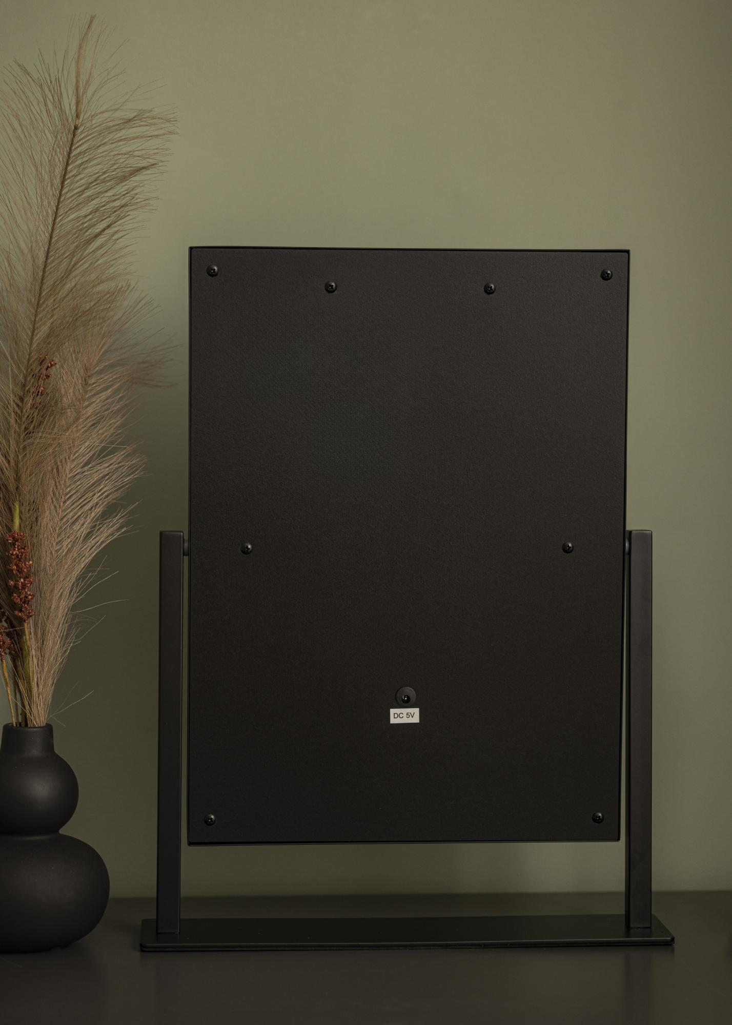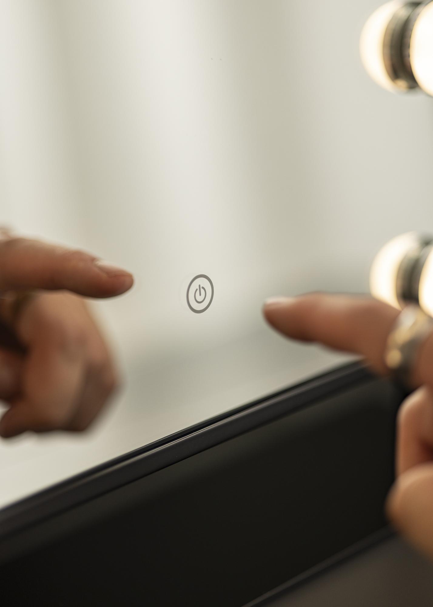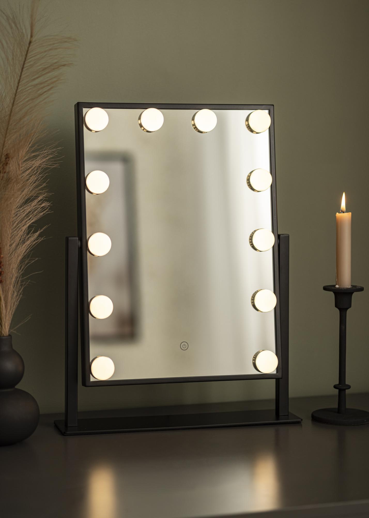 Voici un miroir de maquillage au design luxueux avec 12 ampoules LED décoratives dans une jolie teinte noire. Les ampoules encadrent élégamment la généreuse surface du miroir qui mesure 30x40 cm et donne une lueur blanche chaude en 3000K. L'éclairage s'allume en appuyant sur le bouton tactile sur l'écran et dispose d'une intensité ajustable que vous pouvez facilement régler en maintenant le bouton enfoncé pendant quelques secondes. Le miroir peut être incliné verticalement afin que vous puissiez facilement vous maquiller sous l'angle qui vous convient le mieux. En plus de ses nombreuses fonctionnalités, ce miroir de maquillage devient un détail élégant et crée une vraie atmosphère hollywoodienne dans votre maison!