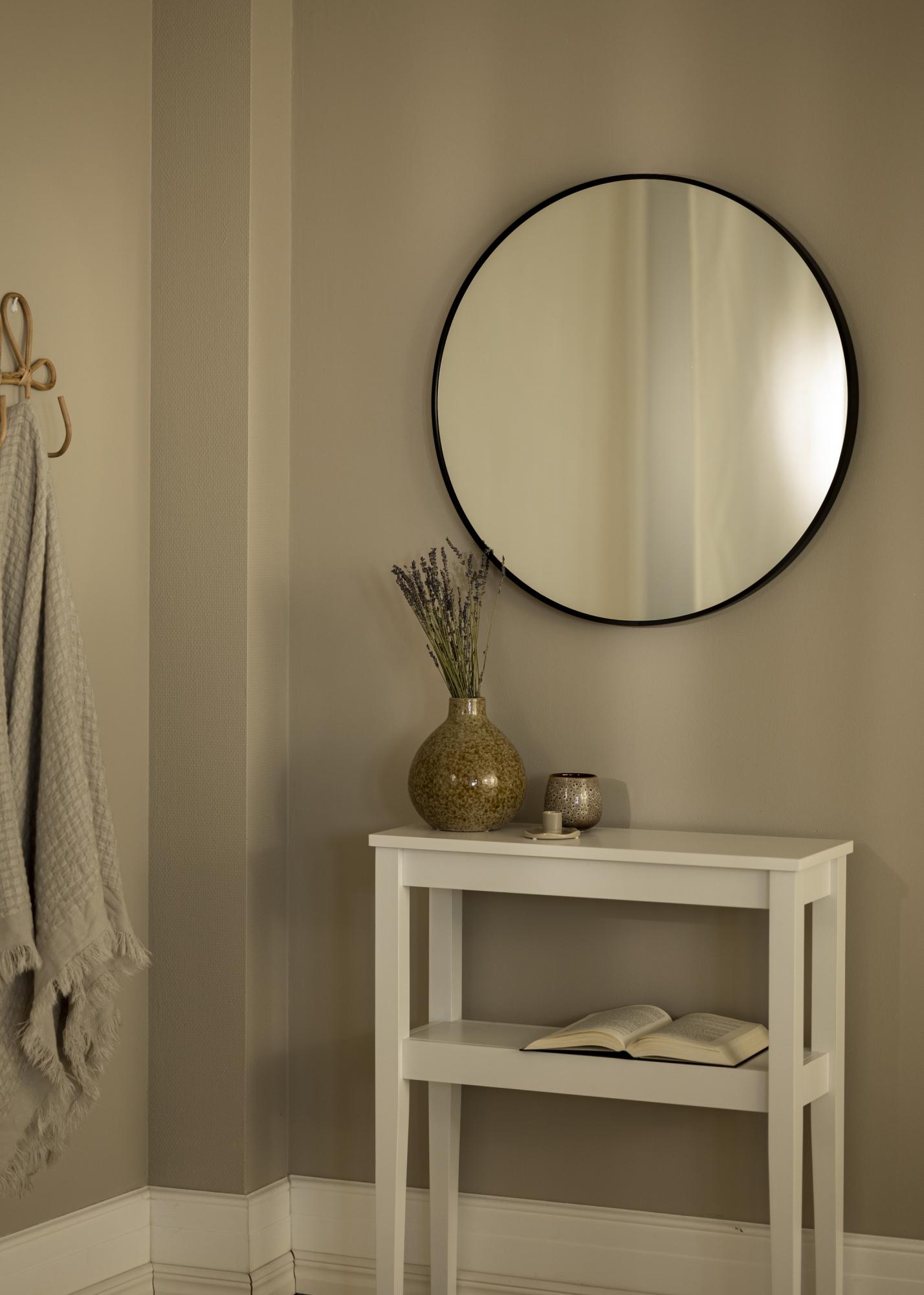 KAILA Round Mirror Edge Black est un miroir rond avec un cadre métallique fin et élégant en noir mat, ce qui lui donne un aspect industriel et tendance. Le cadre a, selon la taille, une profondeur comprise entre 30 et 40 mm, ce qui signifie que le verre du miroir sort un peu du mur et crée un effet 3D intéressant. La profondeur du cadre donne également au miroir une sensation de solidité tout en conservant son aspect minimaliste. Un miroir rond parfait à placer dans n'importe quelle pièce où vous souhaitez ajouter de la fonctionnalité et un design nordique élégant !