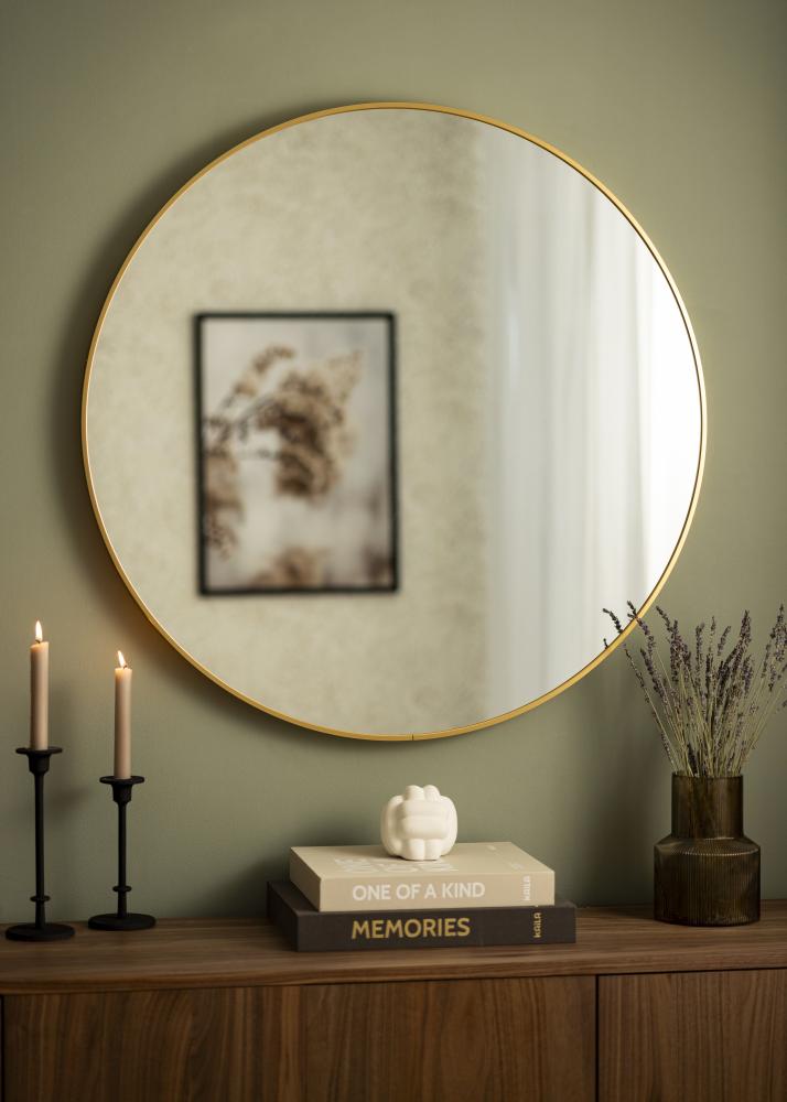 Un miroir rond au design nordique élégant avec un cadre en métal dans une belle finition dorée. Le cadre a une surface brossée, ce qui donne à la belle couleur or un aspect légèrement plus mat. La finesse du cadre est tendance, mais en même temps, en fonction de la taille, le cadre a une profondeur comprise entre 30 et 40 mm, ce qui signifie qu'il sort un peu du mur et crée un effet 3D intéressant. La profondeur du cadre donne également au miroir une sensation de solidité et de robustesse, sans éliminer la sensation minimaliste du miroir.