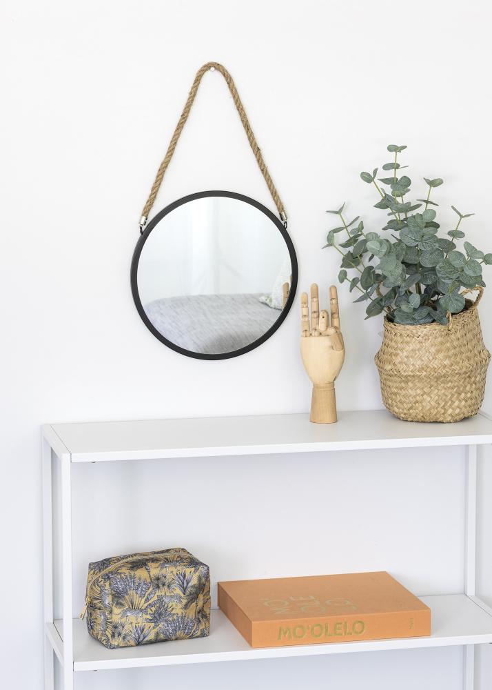 Voici un miroir mural rond parfait pour ceux qui sont attirés par un intérieur d'inspiration marine ! Le miroir est en métal et possède une corde décorative en chanvre pour une jolie suspension. Les supports muraux sont inclus. Le verre du miroir est encadré d'un bord noir qui donne au miroir une belle profondeur. Le miroir mesure 30 cm de diamètre.