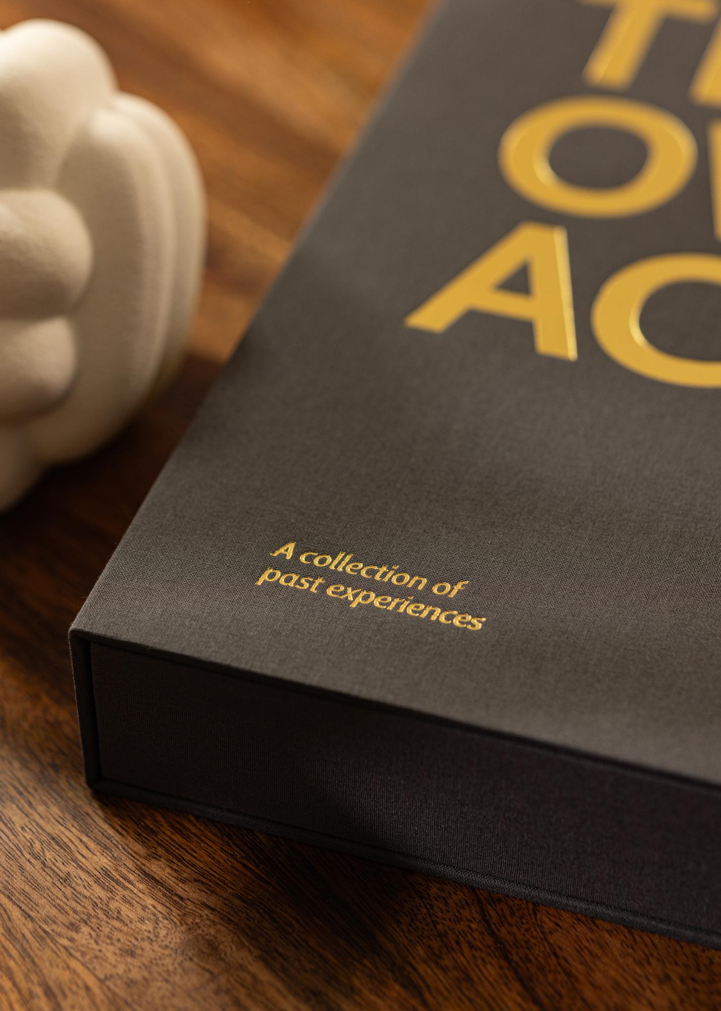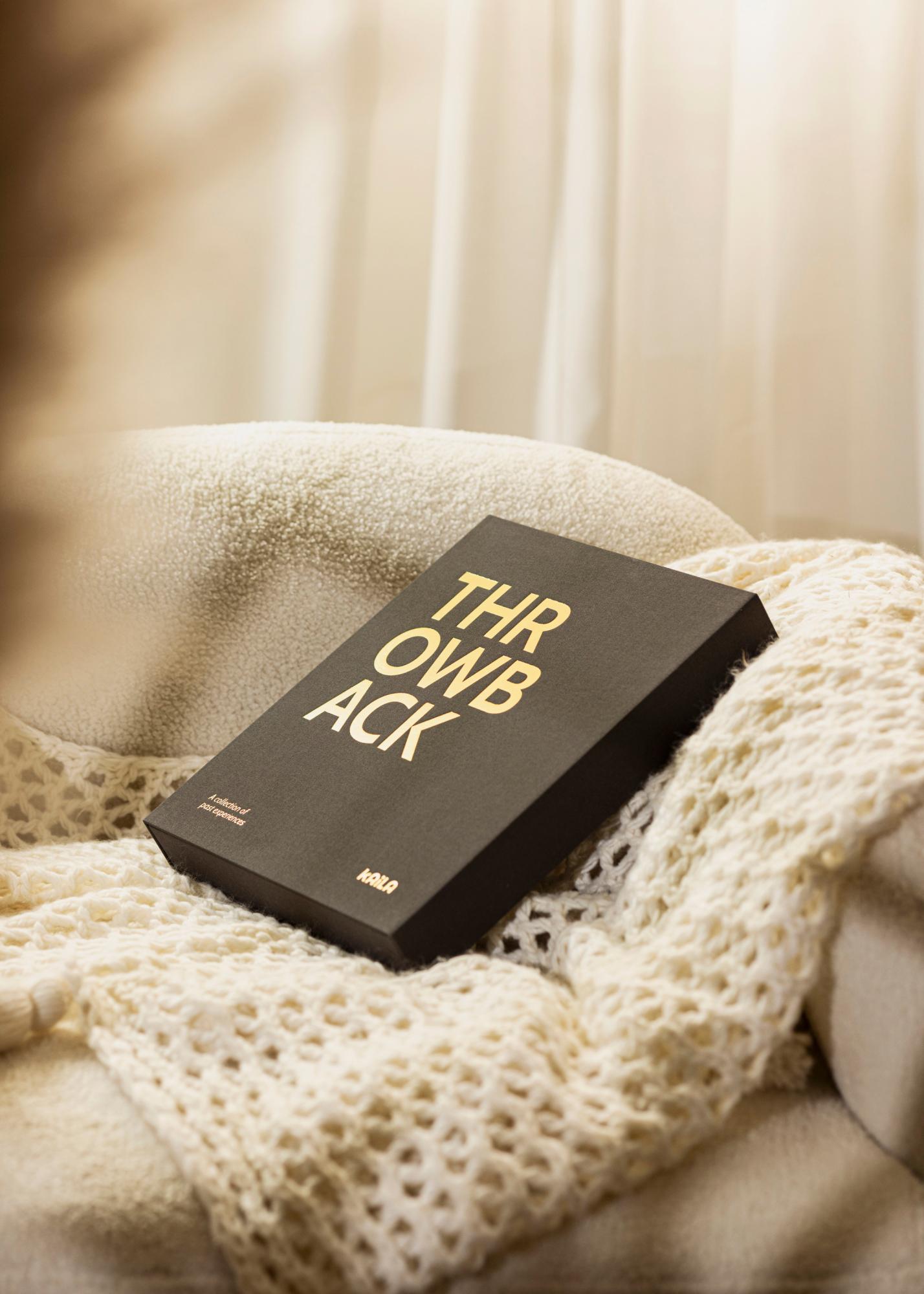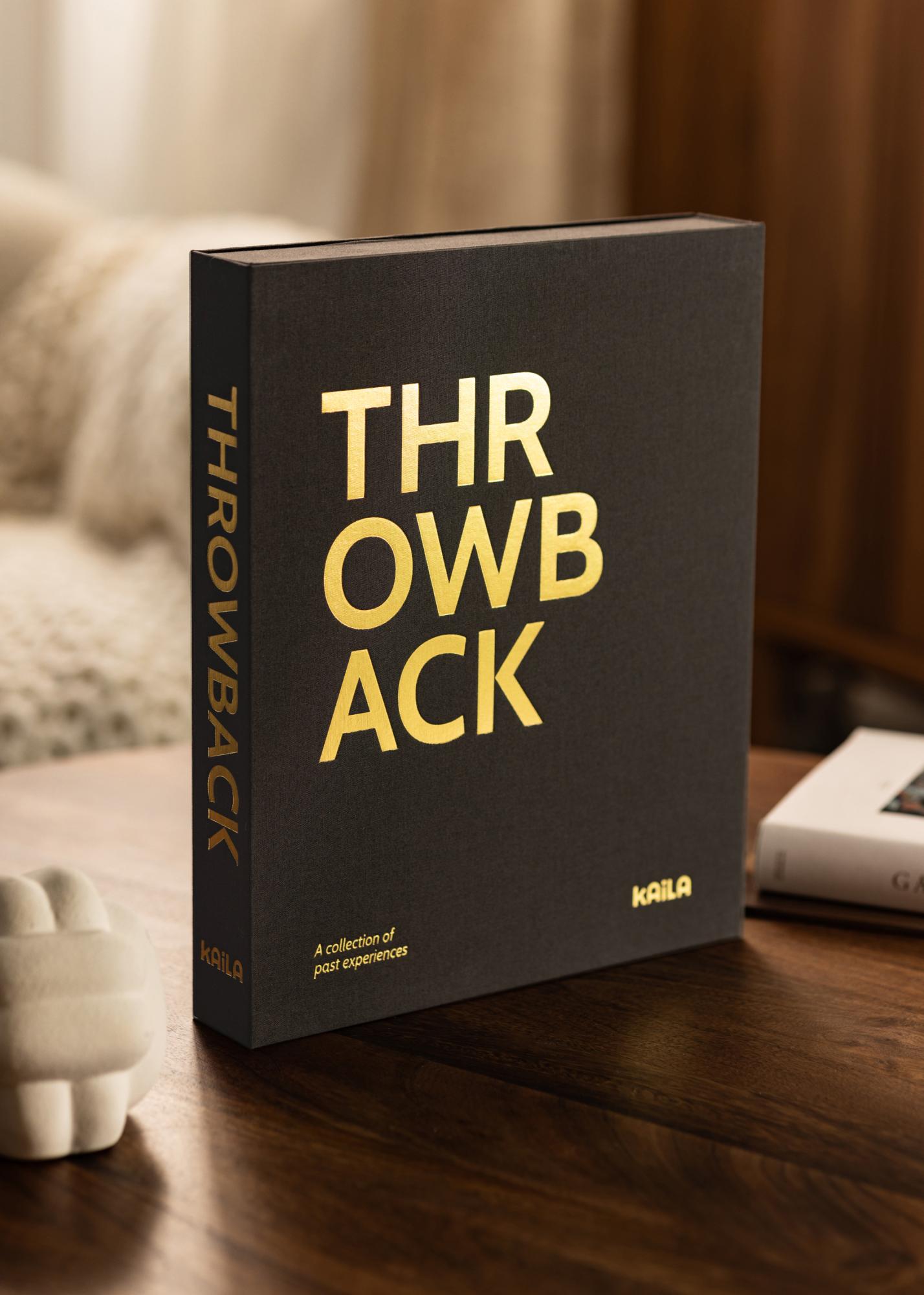 Ceci est un album photo très tendance qui est luxueusement emballé comme un esthétique Coffee Table Book - un ainsi-nommé Coffee Table Photo Album. L'album photo est conçu comme une boîte exclusive que vous ouvrez pour accéder au contenu. La couverture est élégamment habillée d'un textile noir avec une impression dorée dont le texte ”THROWBACK” orne à la fois le devant et le dos de l'album. Ce concept bien connu de flashback donne à l'album photo une impression de modernité et un peu d'impertinence car il diffère vraiment des styles d'album classiques. L'album a également un sous-titre qui précise "A collection of past experiences", imprimé dans le coin inférieur gauche.