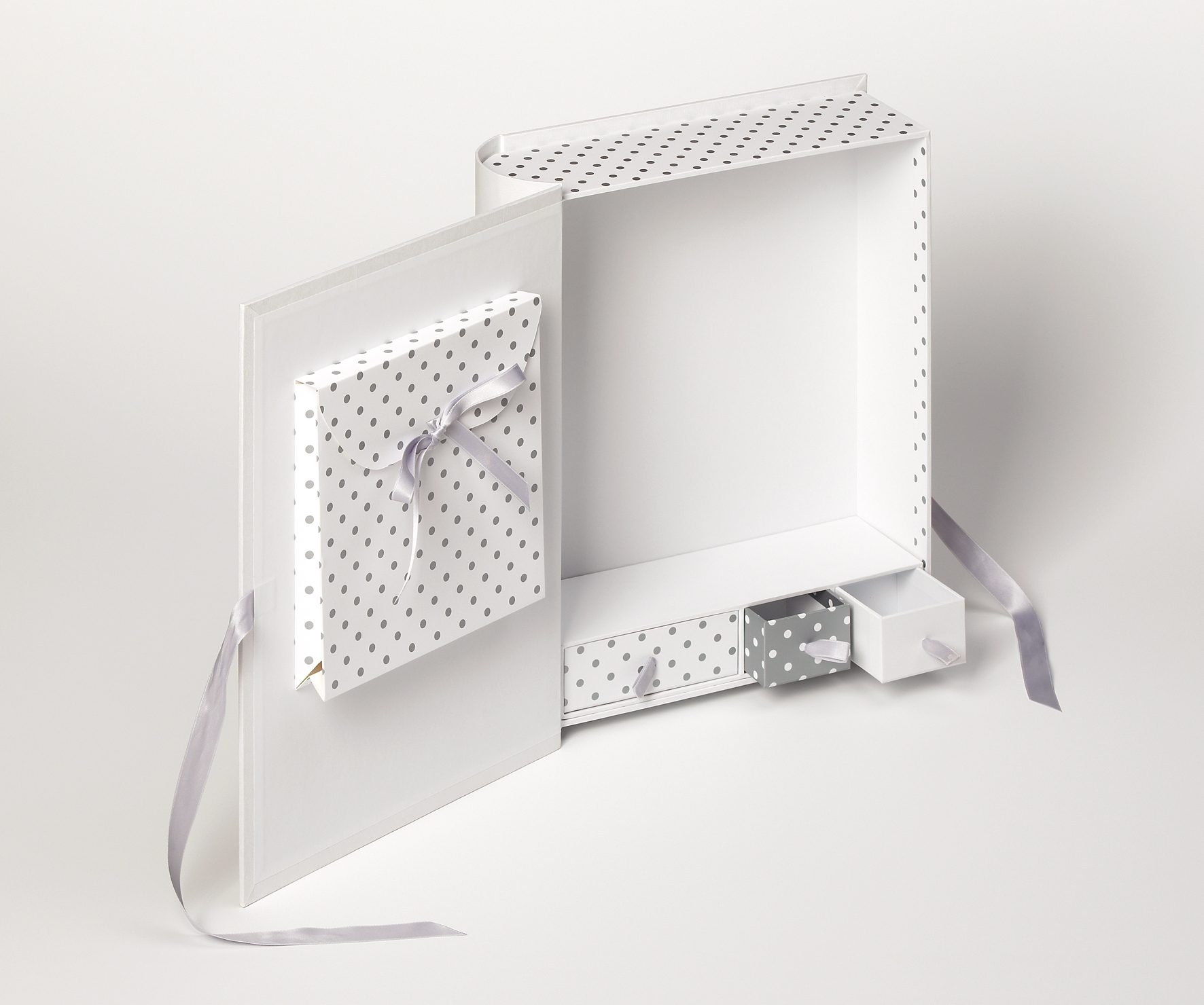 Jolie boîte de rangement pour images et petits objets. La boîte contient 3 petits tiroirs qui conviennent parfaitement, par exemple, à la première dent. Il y a également un sac de rangement que vous pouvez fermer. Vous pouvez mettre votre propre photo sur le devant de la boîte pour ajouter votre touche personnelle.