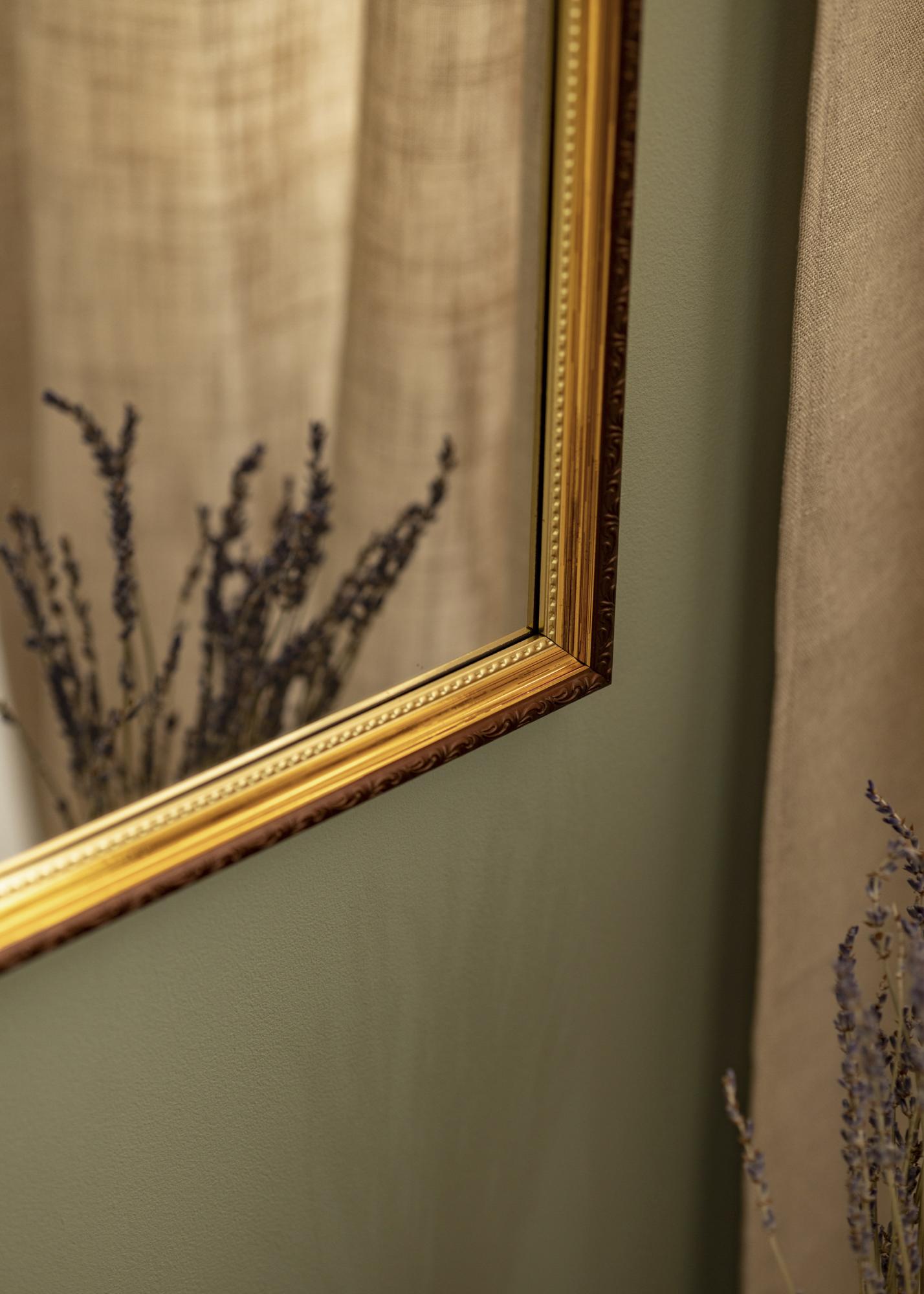 Abisko Or est un miroir mural pour ceux qui sont à la recherche d'un miroir décoratif dans un aspect rétro très élégant. Le miroir a une baguette de 25 mm de largeur de teinte brune et une couleur dorée exclusive entourant le verre miroir. Le cadre a un profil joliment ornementé, ce qui fait de ce miroir mural un élément mural esthétique convenant tout aussi bien dans l'entrée comme dans la chambre.