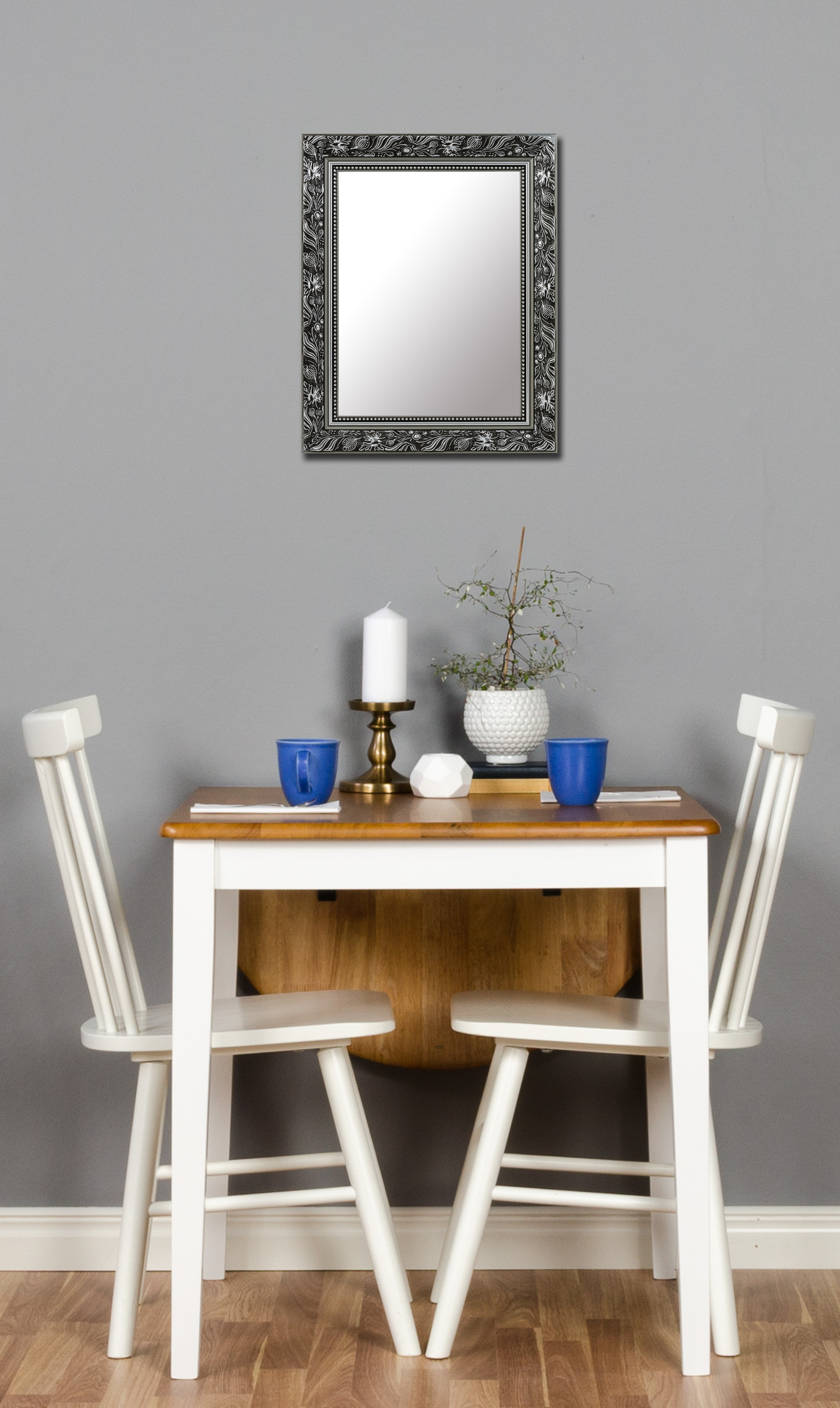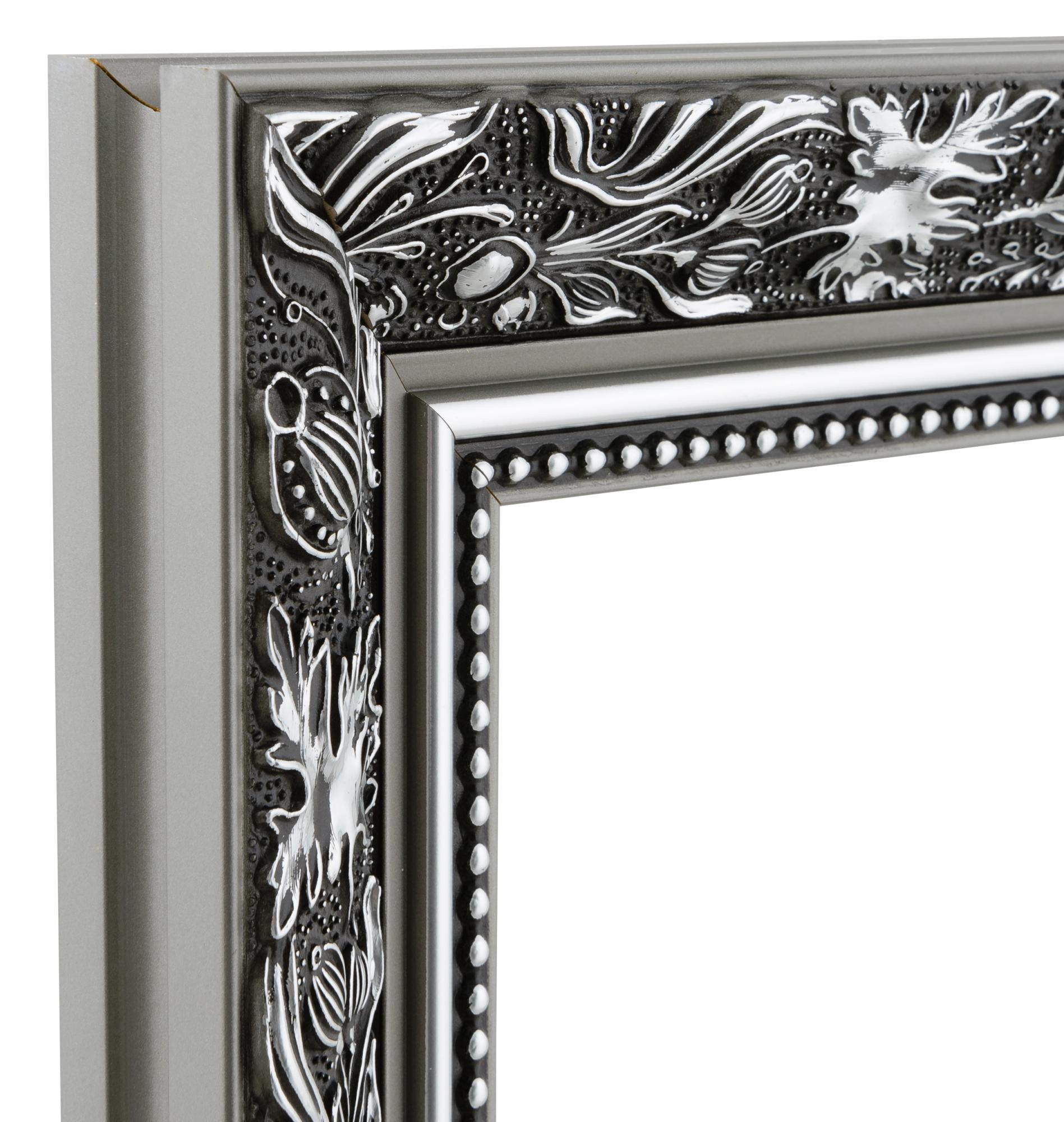 Regardez-vous avec style dans ce superbe miroir qui se décline en noir et argent ! Le cadre du miroir est doté de détails à la fois mats et brillants, ce qui le rend très décoratif. Il dispose à l'avant d'une large section ornée de motifs de feuilles, de parties lisses en couleur argent mat et brillant et d'une bordure à motifs de perles le long du verre. Comme ce miroir est fabriqué par du personnel qualifié dans notre propre atelier de cadres, vous pouvez vous attendre à un produit de haute qualité !