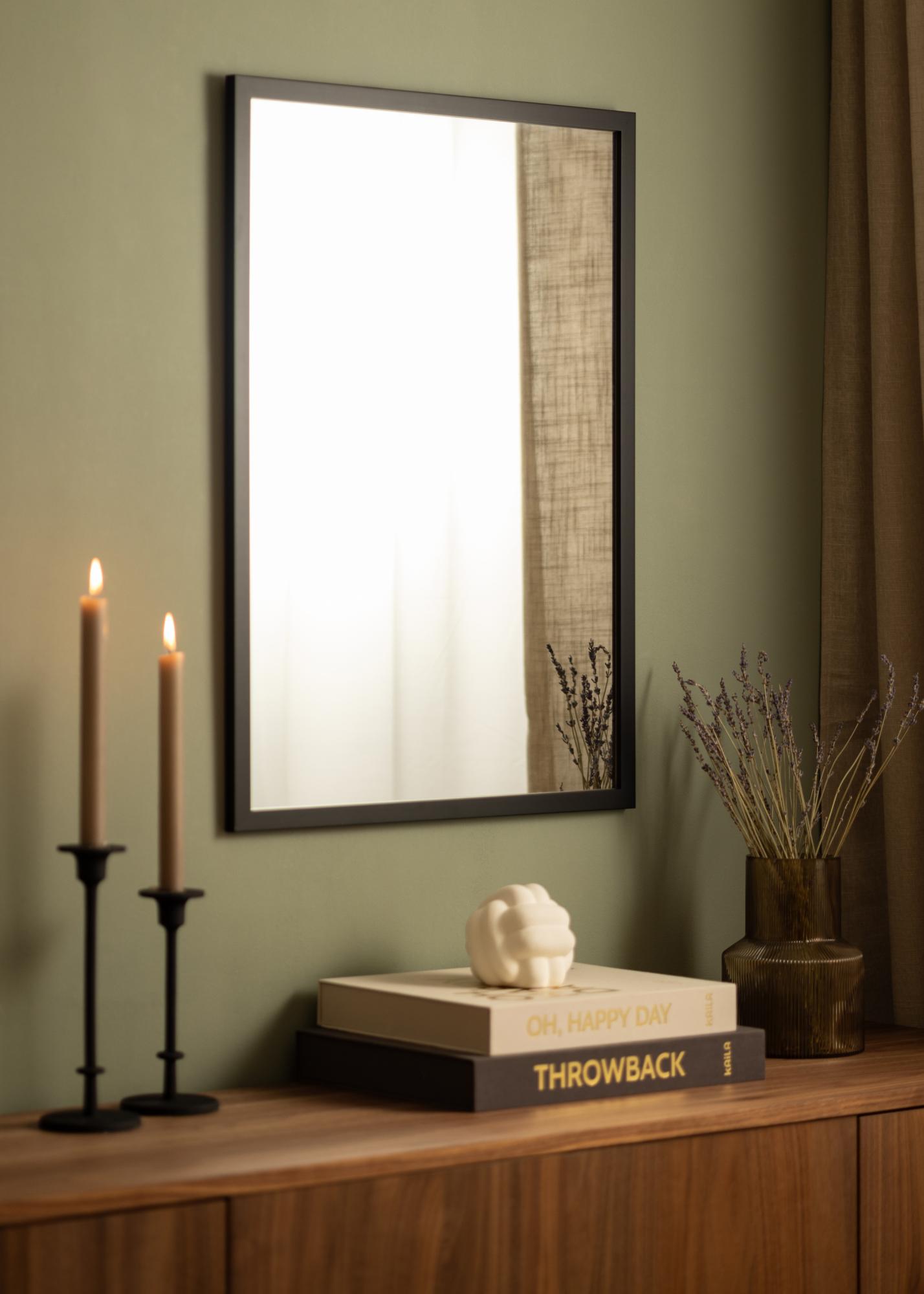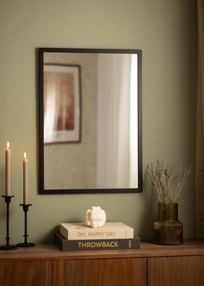 Black Wood est un excellent choix pour ceux qui sont à la recherche d'un miroir mural épuré avec un encadrement simple en noir. Le miroir est conçu avec du bois d'ayous peint et doté d'un verre miroir sans teinte. L'encadrement d'une largeur de 22 mm a un profil carré traditionnel, ce qui laisse toute l'attention se porter sur le verre miroir.